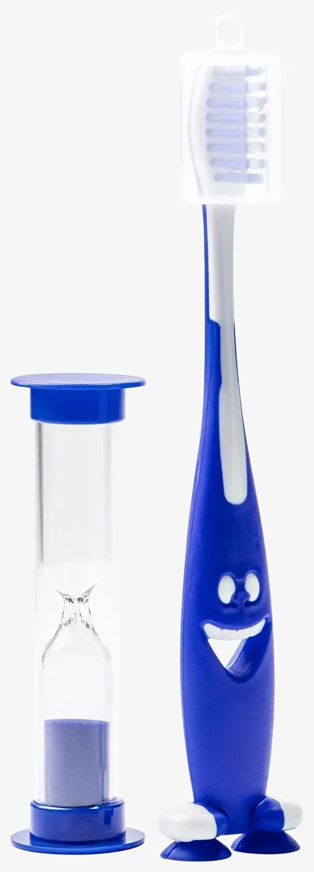 The toothbrush MESLER features a colored body with a smooth finish and suction cups at the base for better grip. A 2-minute hourglass is integrated to measure brushing time.