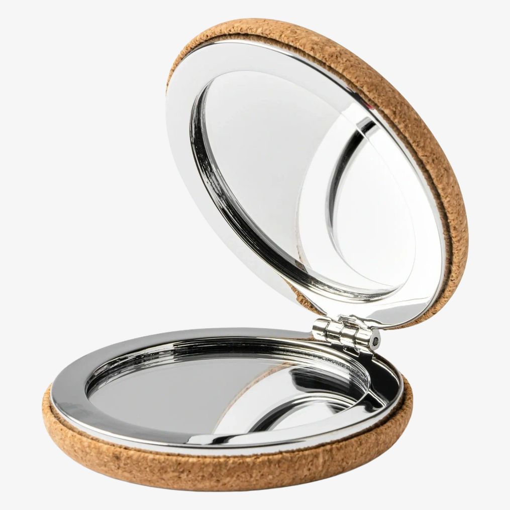 The folding pocket mirror consists of two mirrors, one regular and one magnifying, allowing use according to need. The frame combines natural cork and chrome metal for a lightweight and durable design.