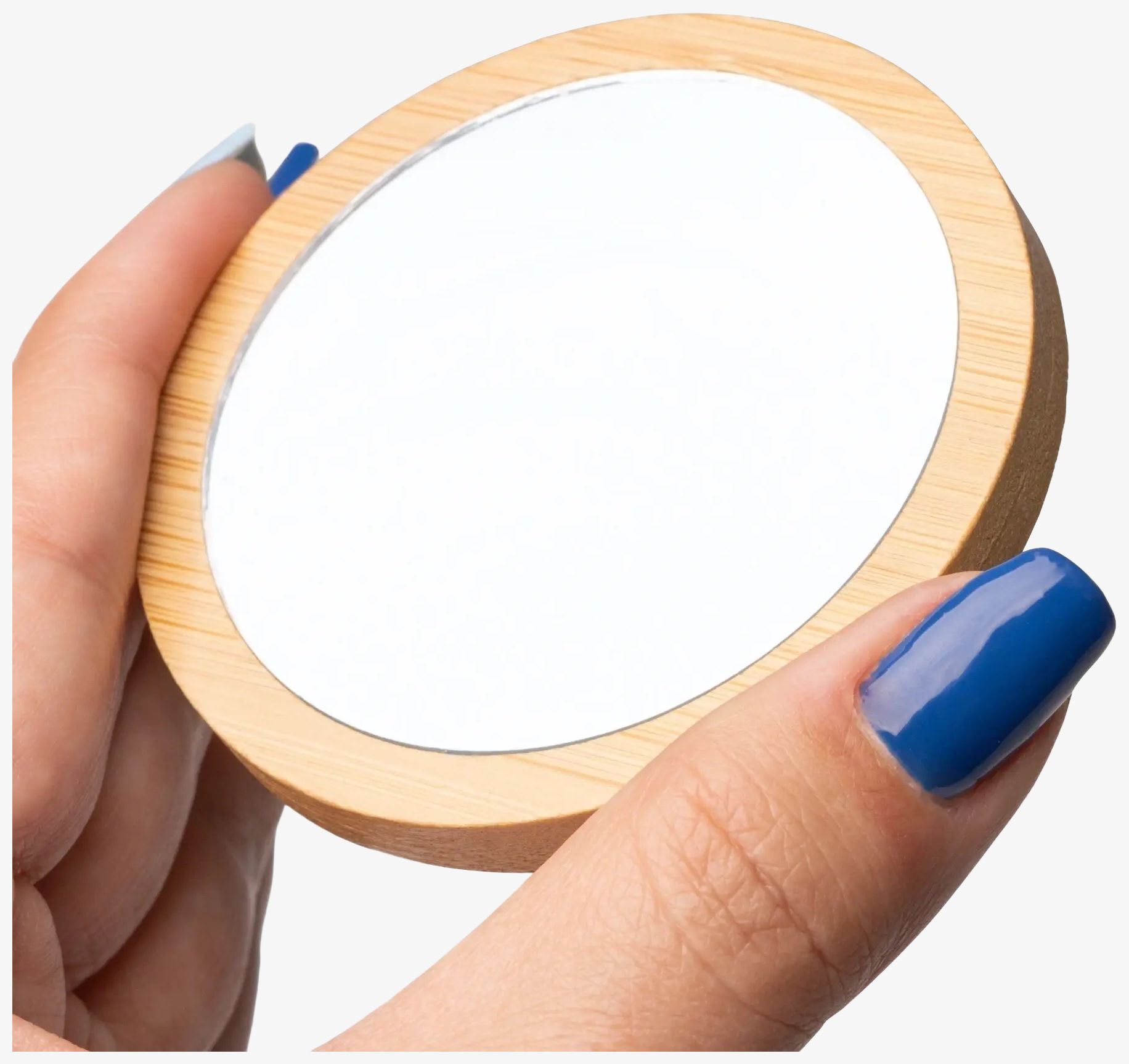 The MONDO pocket mirror with bamboo back is designed for mobile use thanks to its small size. It is presented in an eco-designed box.