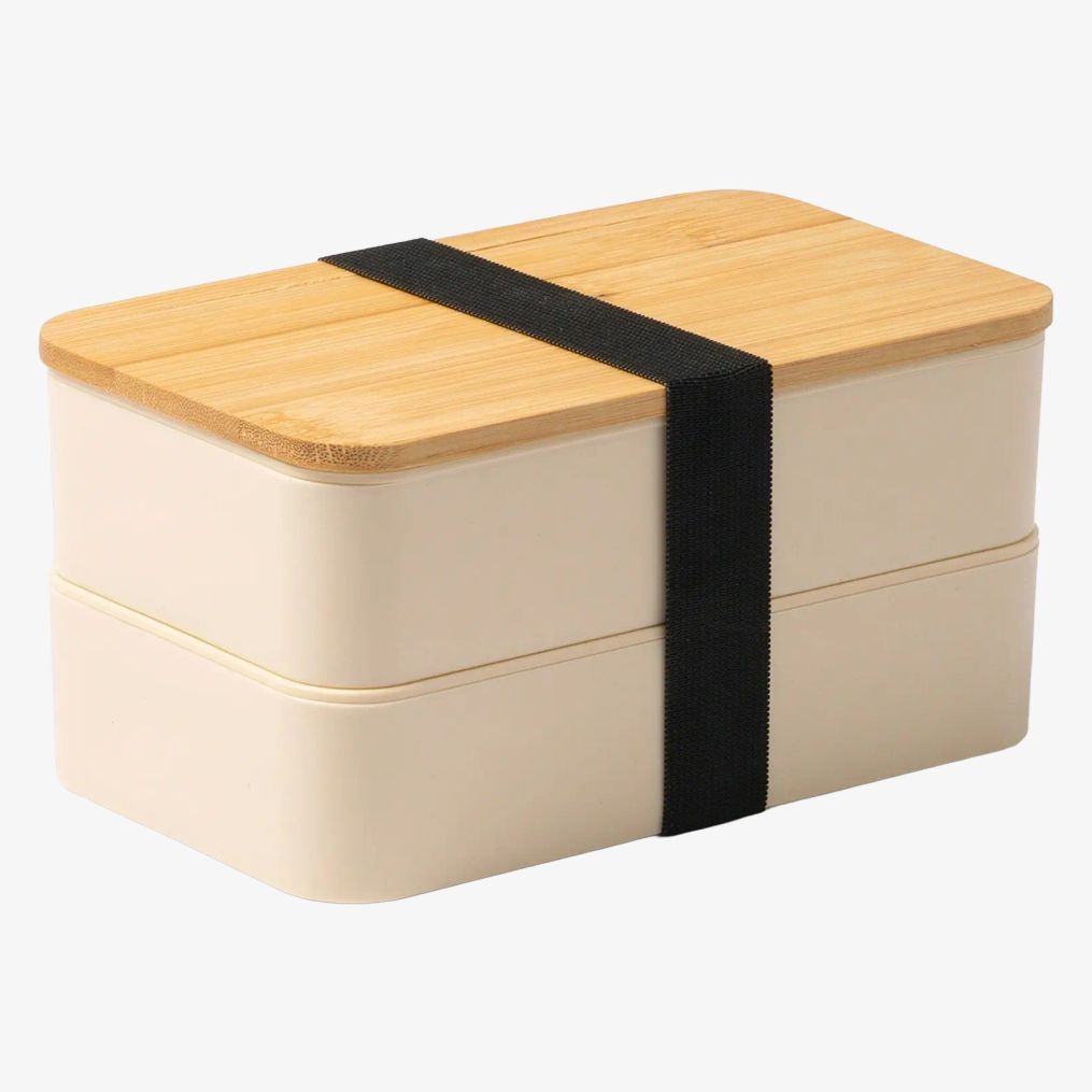 The polypropylene lunch box has two compartments and a bamboo lid. It includes a cutlery set, a detachable divider and a tightening strap. Capacity is 800 ml and dimensions are 18 x 10.6 x 9.6 cm.
