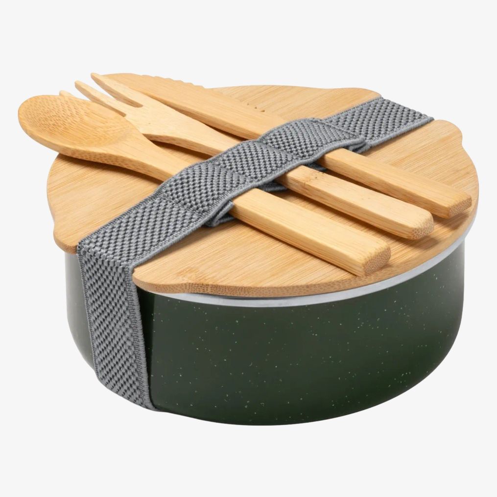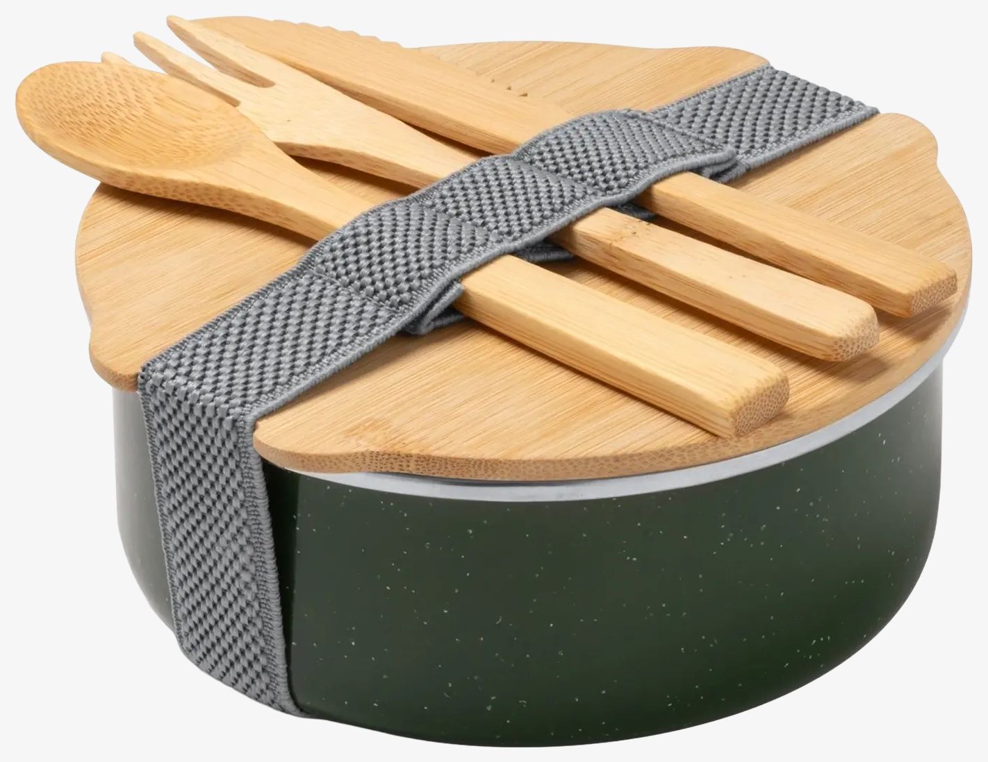 The metal lunch box EVELIN combines a durable ceramic coating with a bamboo lid secured by elastic for food safety. It includes a set of bamboo cutlery. Its 750 ml capacity allows carrying meals.