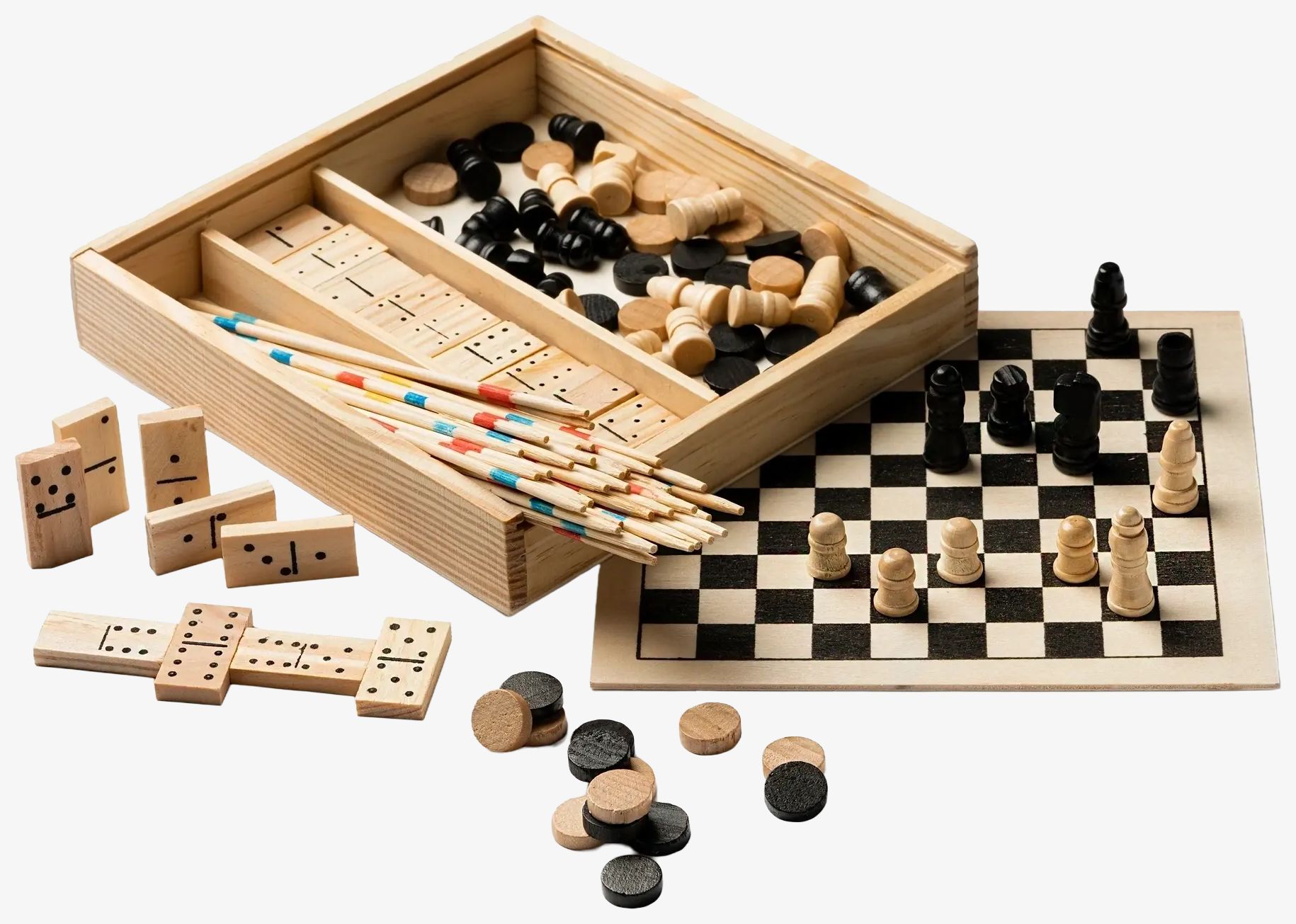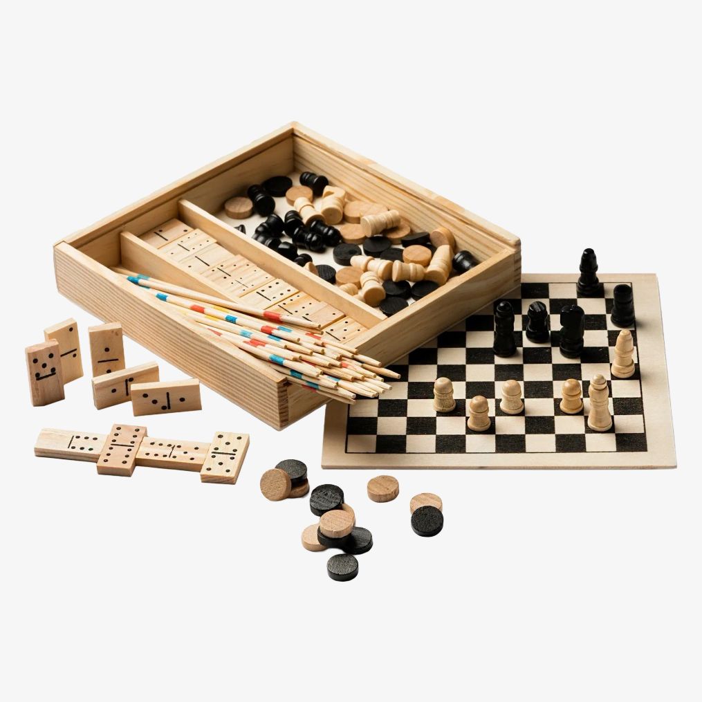 The GALVY includes four wooden skill games: mikado, chess, checkers and dominoes in a box with a sliding lid that also serves as a table.