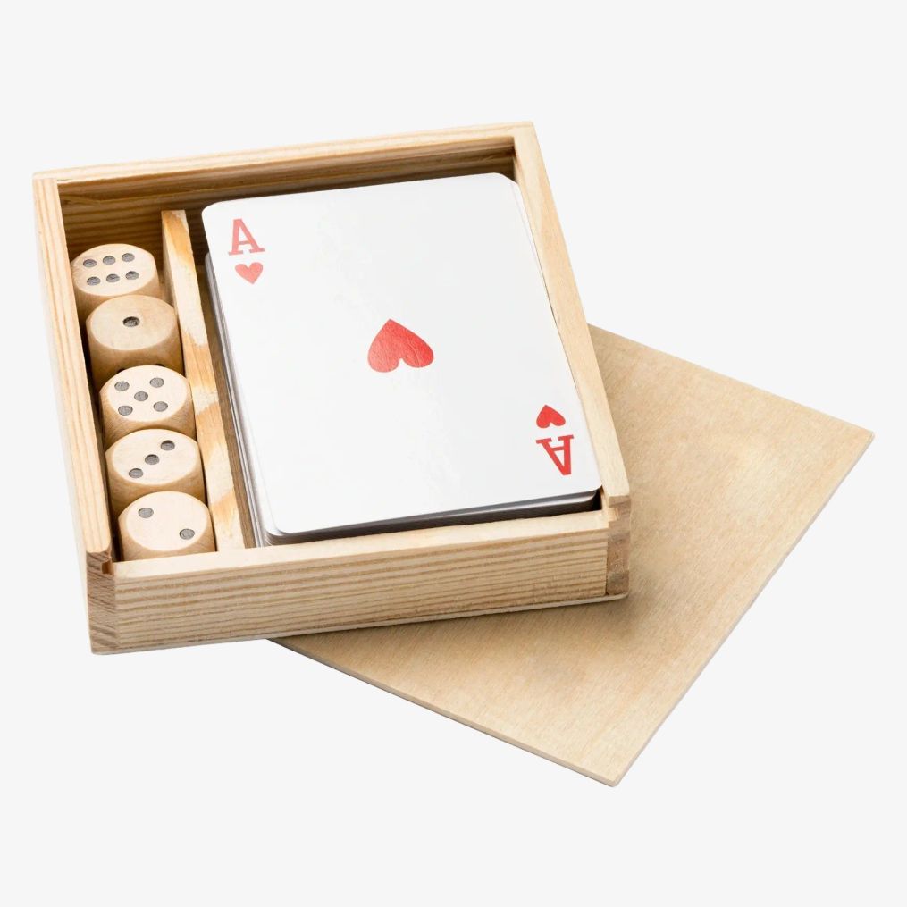 The BRISCA combines two wooden board games with dice and French cards, stored in a two-compartment wooden box with a sliding lid.