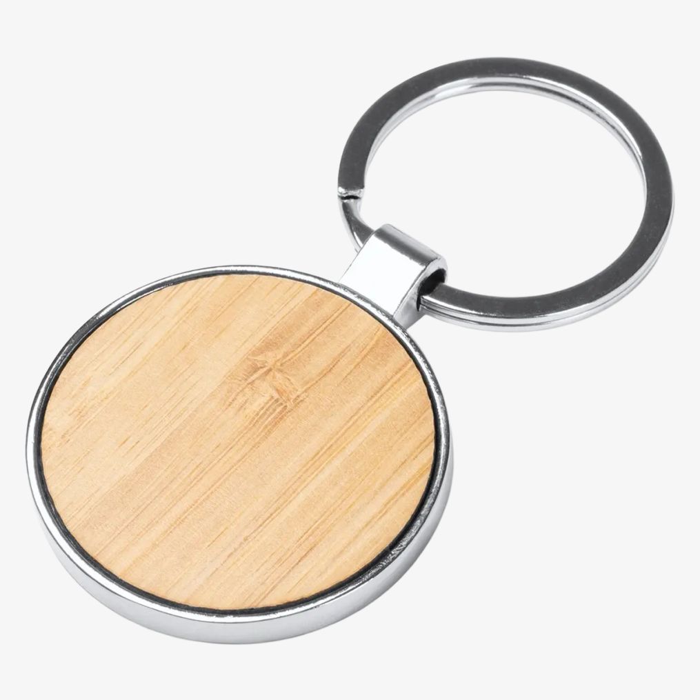The circular bamboo keychain with a metal finish is a durable accessory for carrying keys. Bamboo is a renewable natural material known for its strength. The circular design offers a classic shape while the metal finish adds a touch of sophistication.