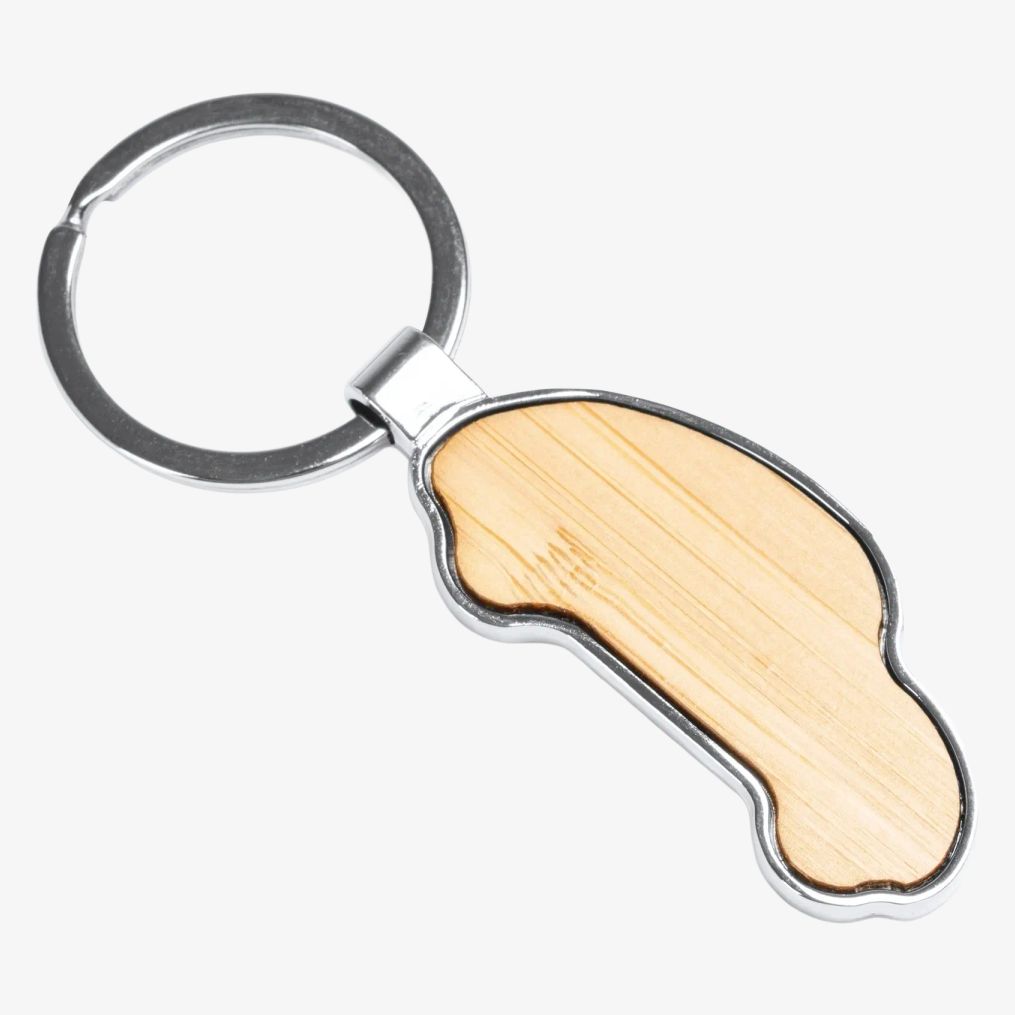 The bamboo car-shaped keychain with metal finish combines durability and functionality. The car shape provides a distinctive look. Bamboo is a natural renewable material known for its strength. The chrome metal finish completes its design.
