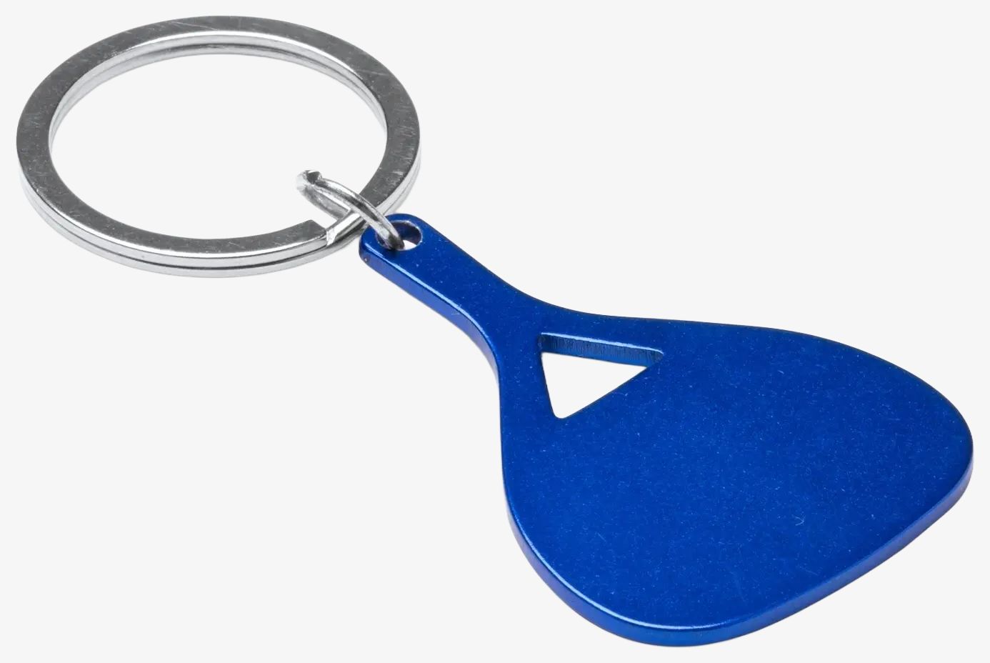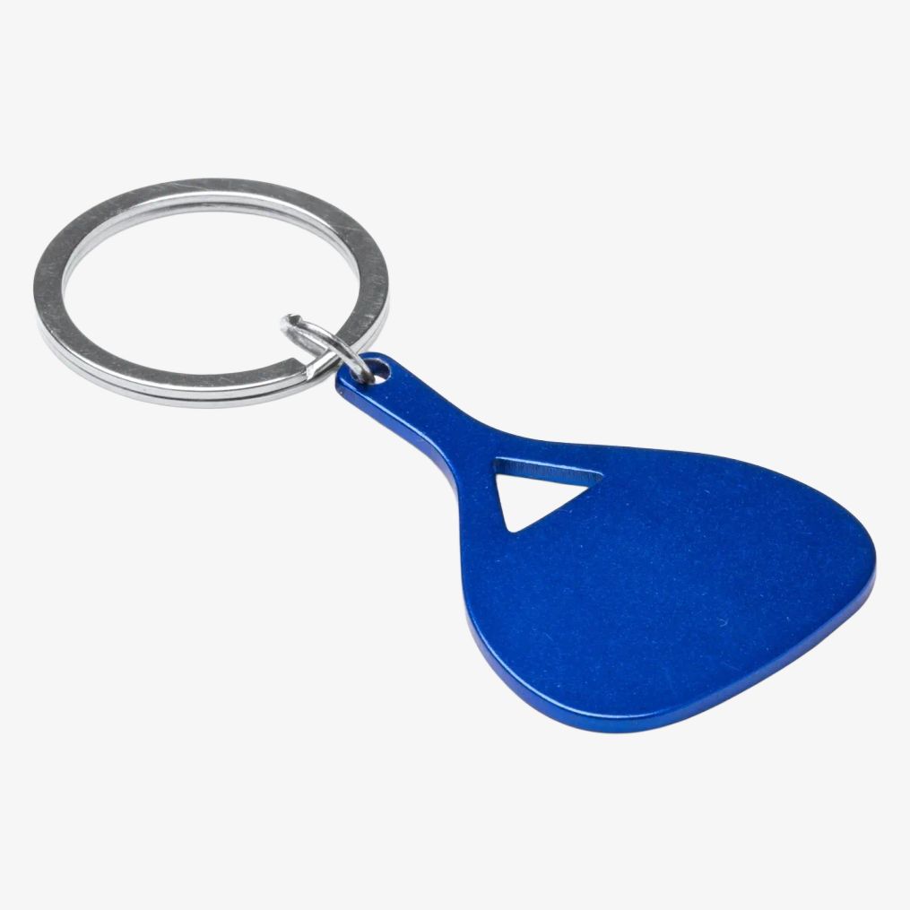 The aluminum keychain shaped like a padel bat is compact and lightweight. It allows keys to be carried with an easy grip. Its size remains suitable for everyday use.