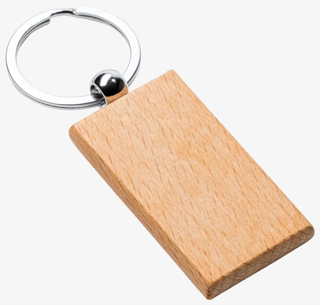 The rectangular keychain is made of natural wood combined with a metal ring. This mix of materials offers a simple and functional structure.