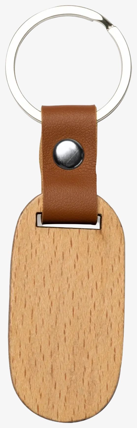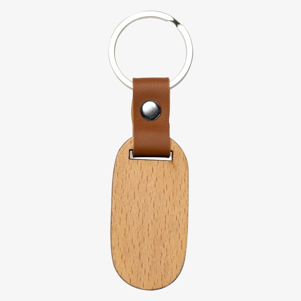 The oval keychain is made of natural wood with faux leather finishes. It has an oval shape and dimensions suitable for everyday use.