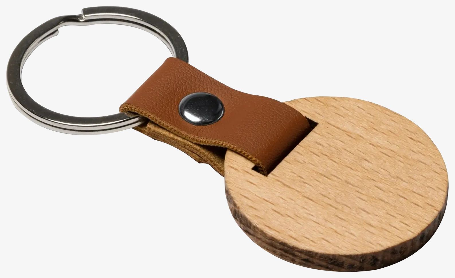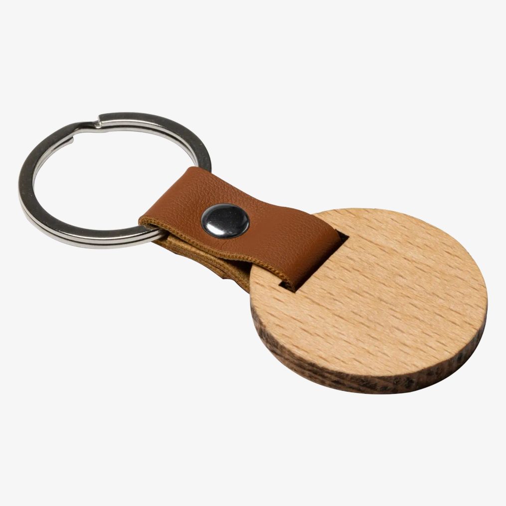 The round keyring in natural wood features a surface with faux leather finishes that provide a neat appearance. The compact dimensions allow practical daily use.