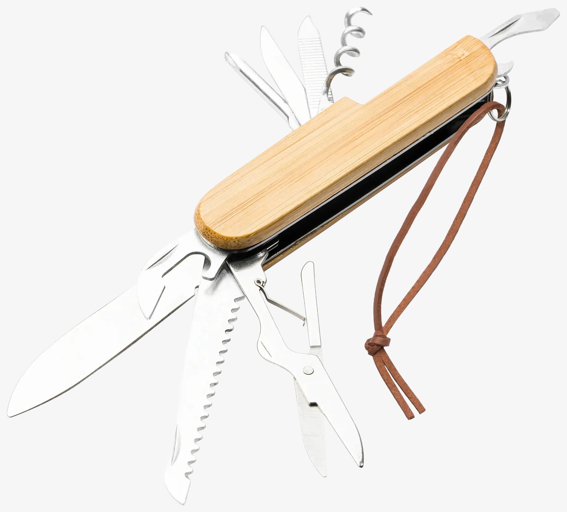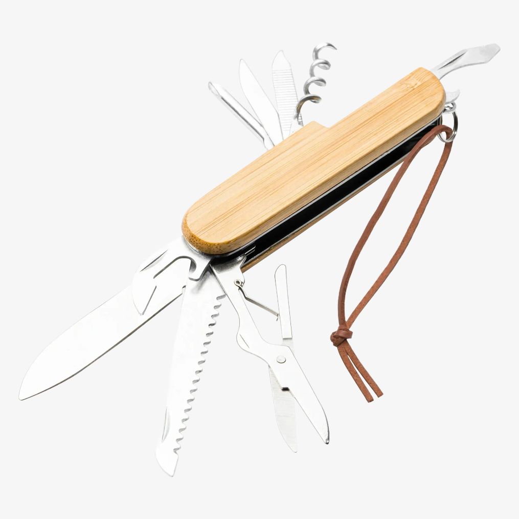 The Swiss knife is made of stainless steel with a bamboo body and includes a faux leather carrying strap. It features nine functions for various uses.
