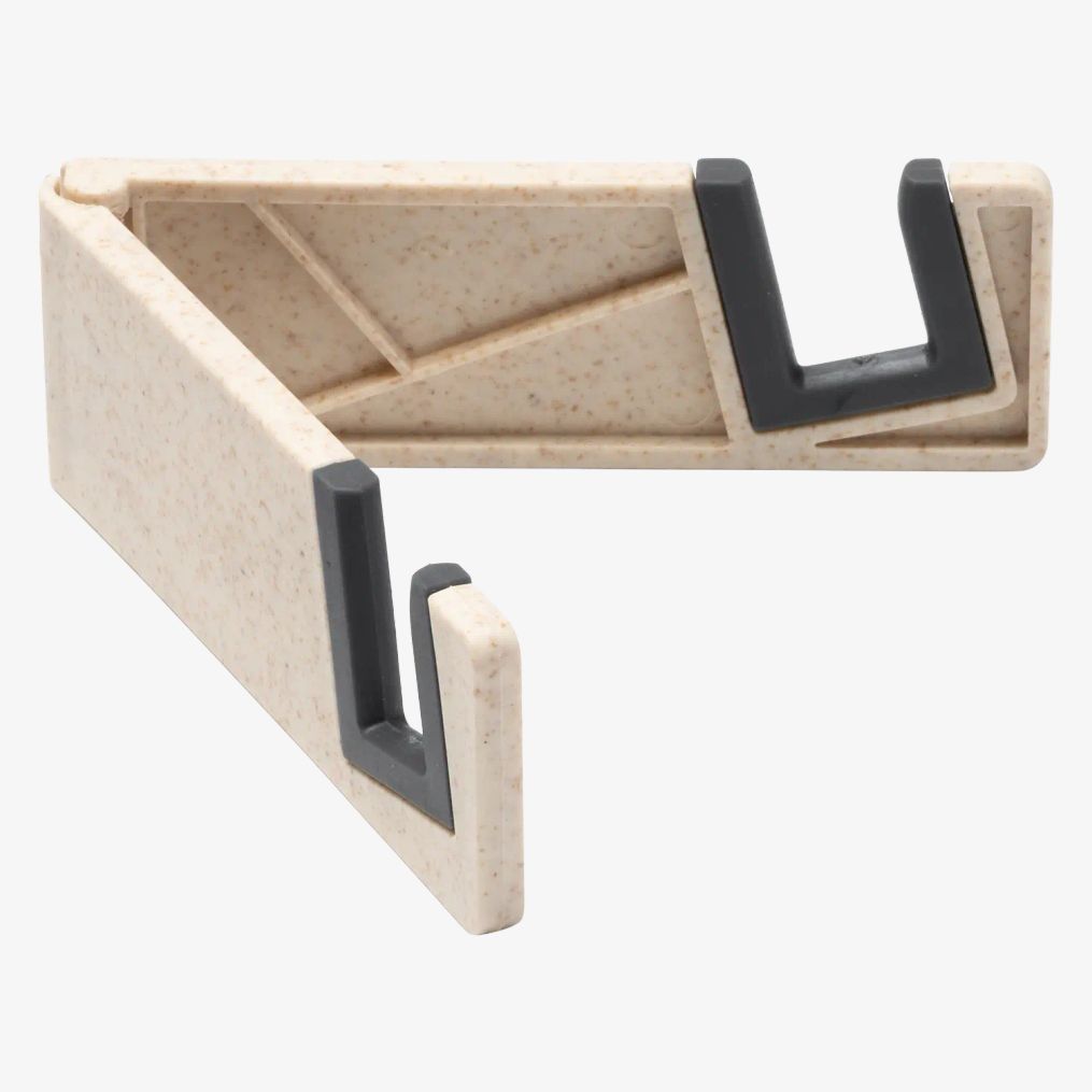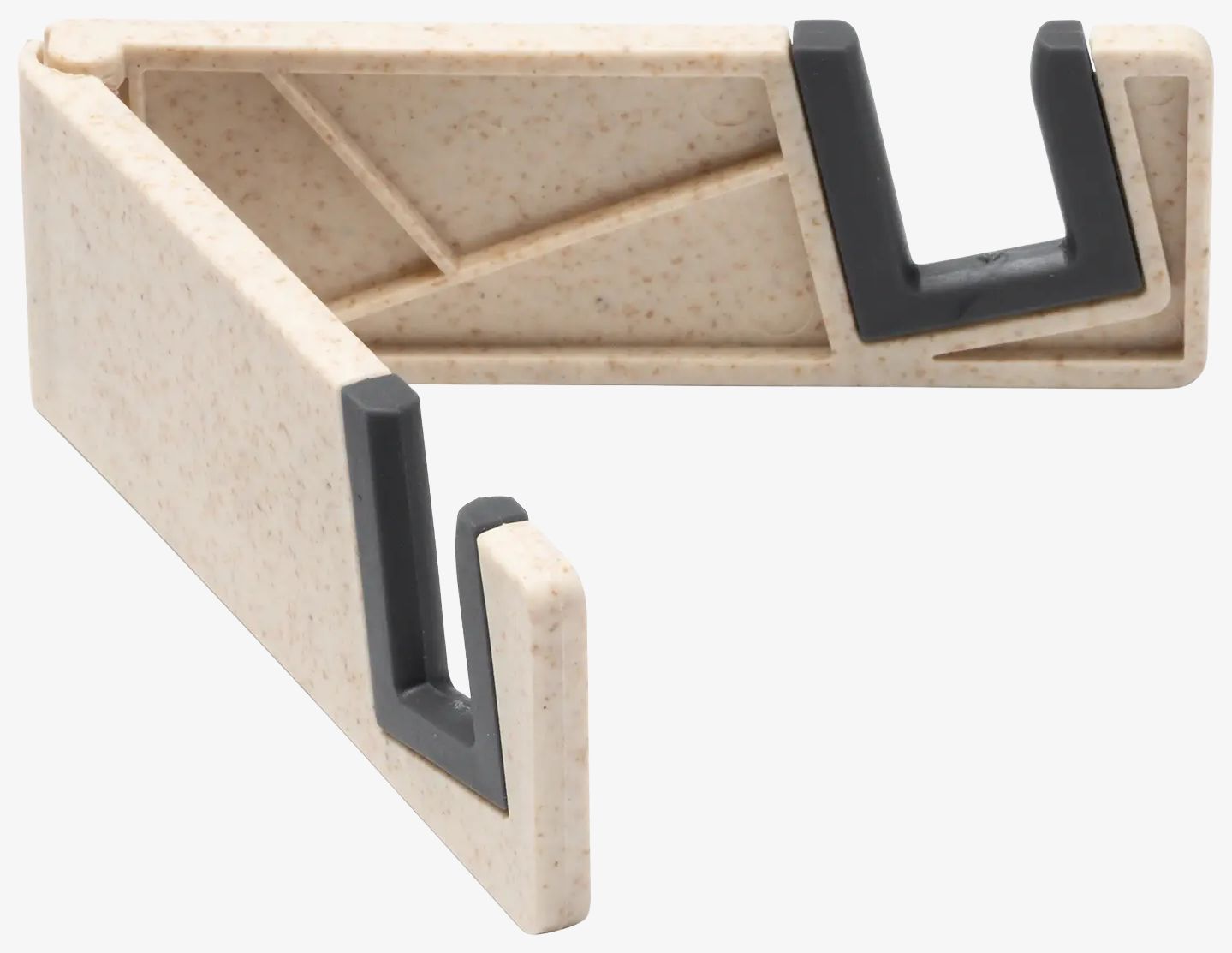The foldable mobile phone stand is made from wheat fiber with non-slip upper edges. It allows stable use on various surfaces.