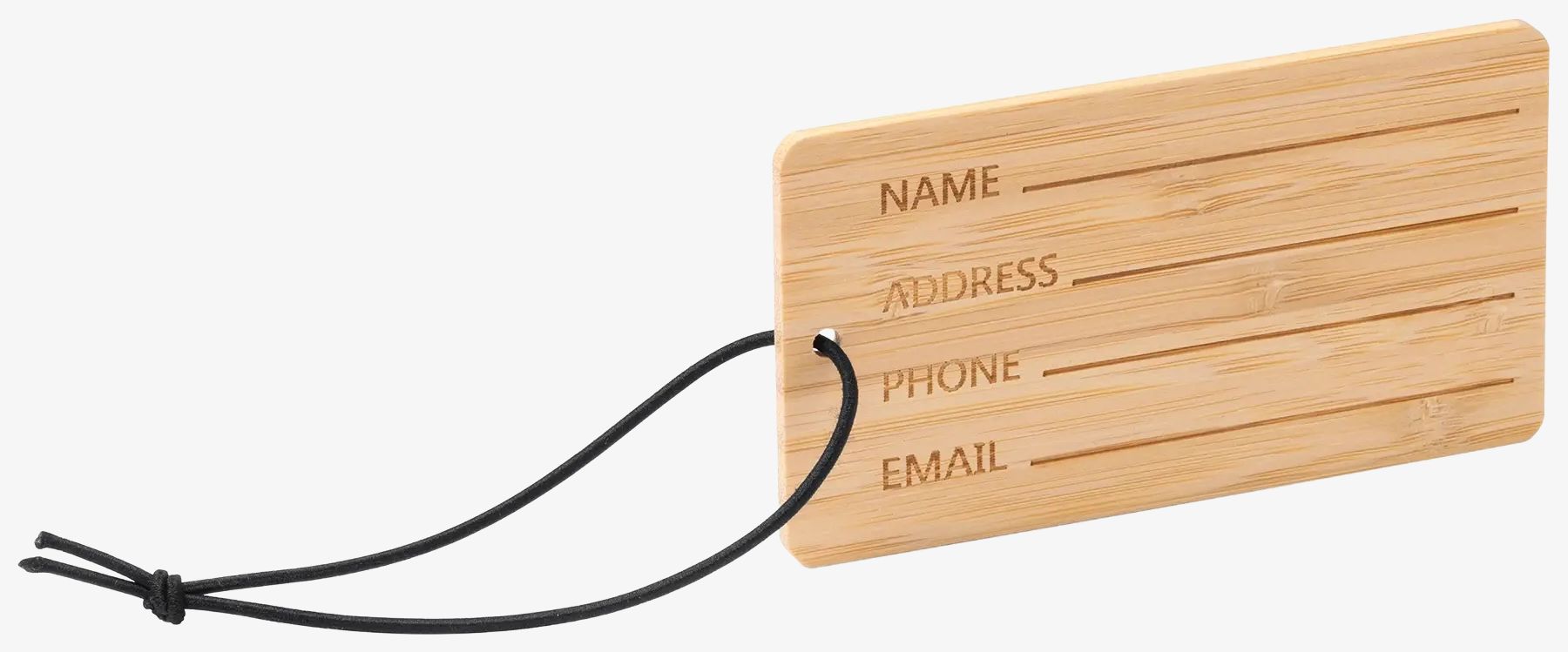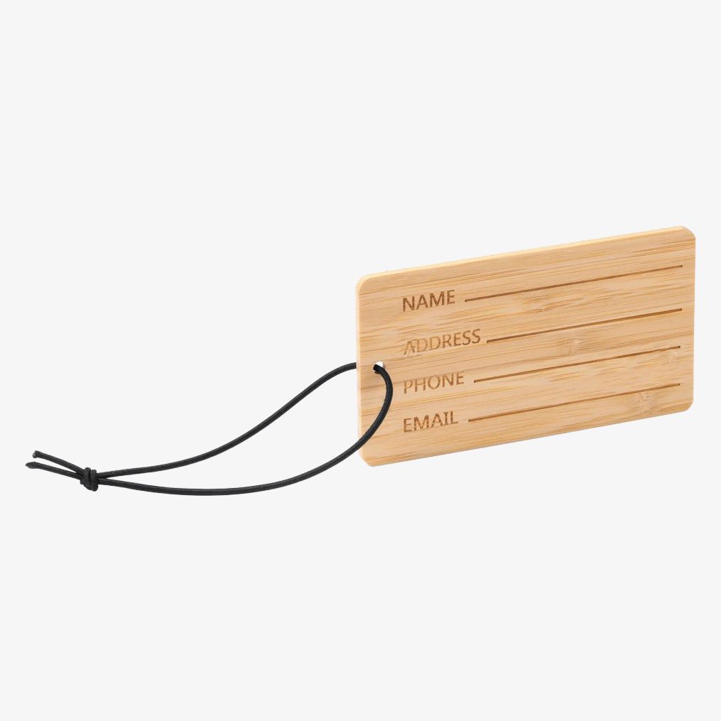 The luggage tag KABORE is made of bamboo and equipped with a black elastic strap. It measures 11 x 3 x 6 cm, facilitating attachment to luggage.