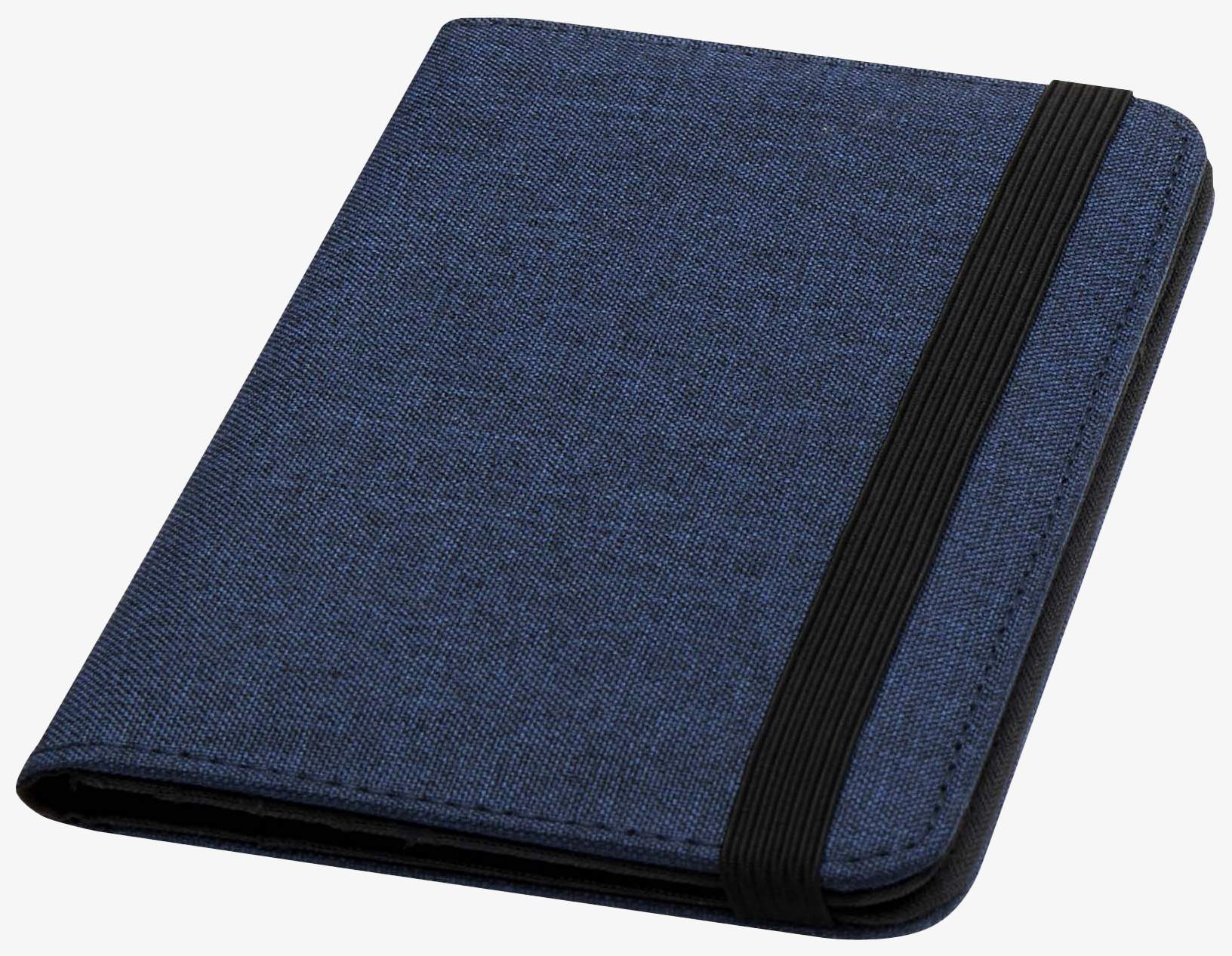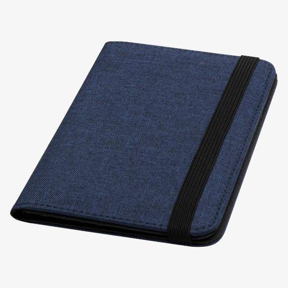 The Ross RFID passport holder is made of recycled polyester. It includes pockets for passport, tickets, credit cards, and other items. An elastic closure secures the contents.
