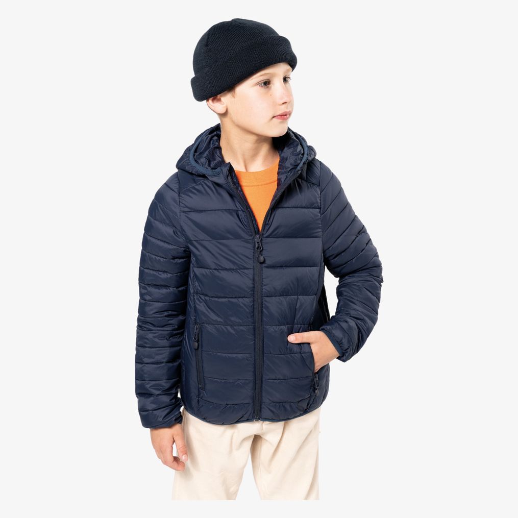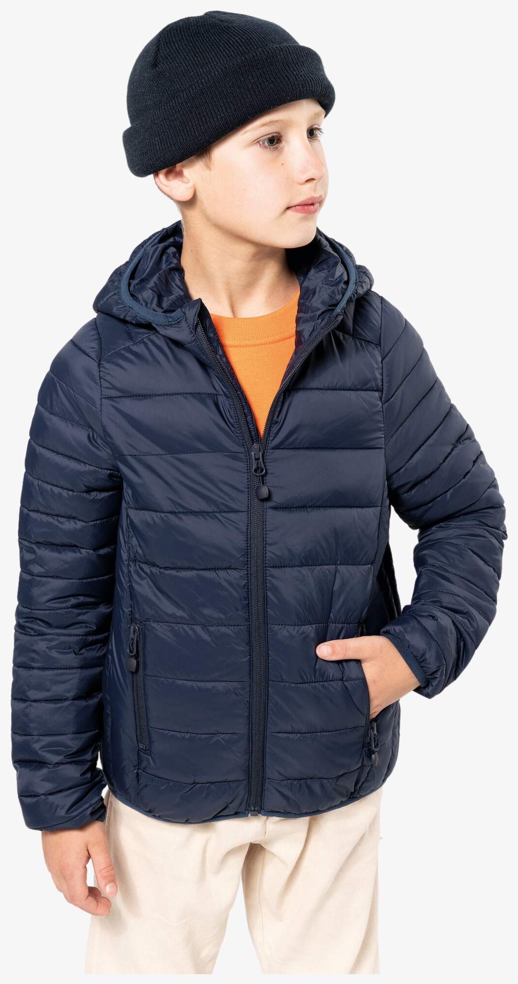 The lightweight hooded jacket for children is made of polyamide with an interior polyester filling. It is compressible into its storage bag and has two zipped pockets at the front. The hood has a contrasting interior except for the navy color.
