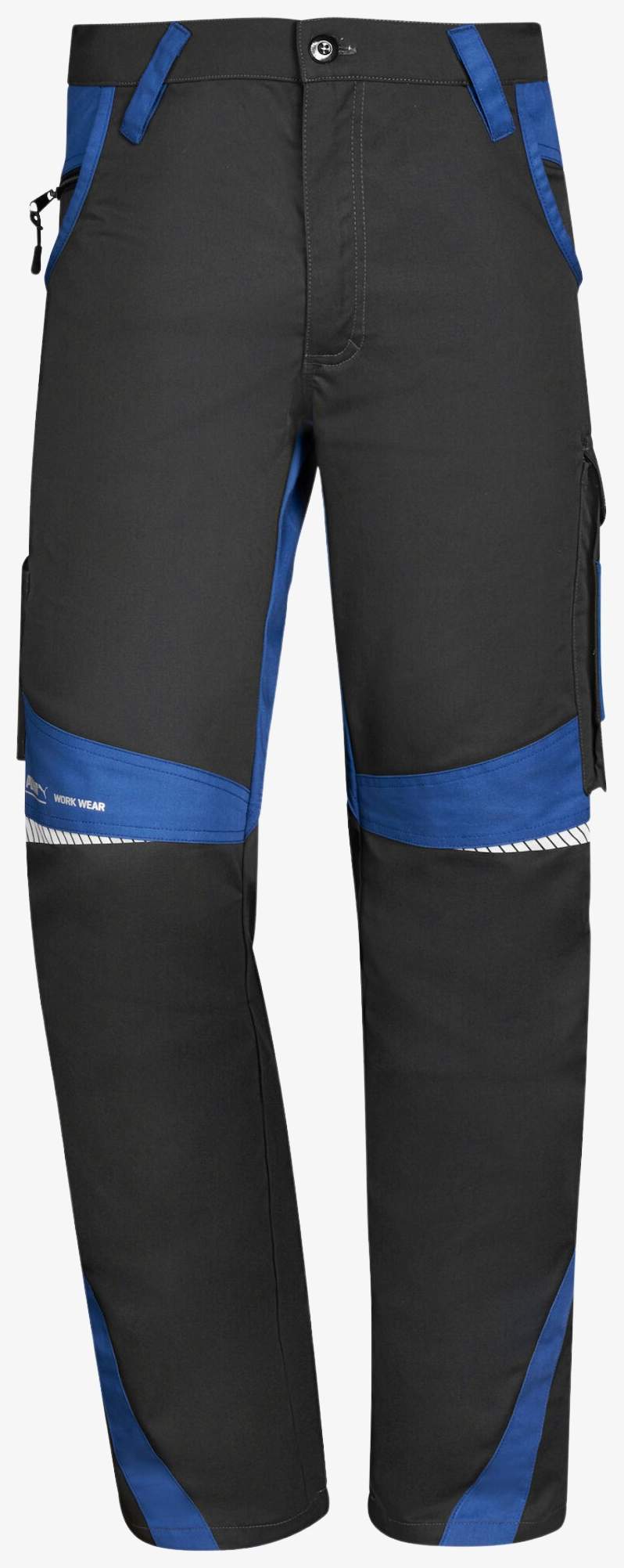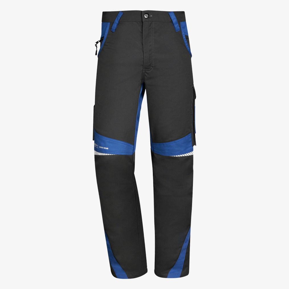 The men's work pants includes a stretch waist with belt loops, two back pockets, a mobile phone pocket and a carpenter's tape measure pocket. It incorporates a segmented reflective area above the knee.