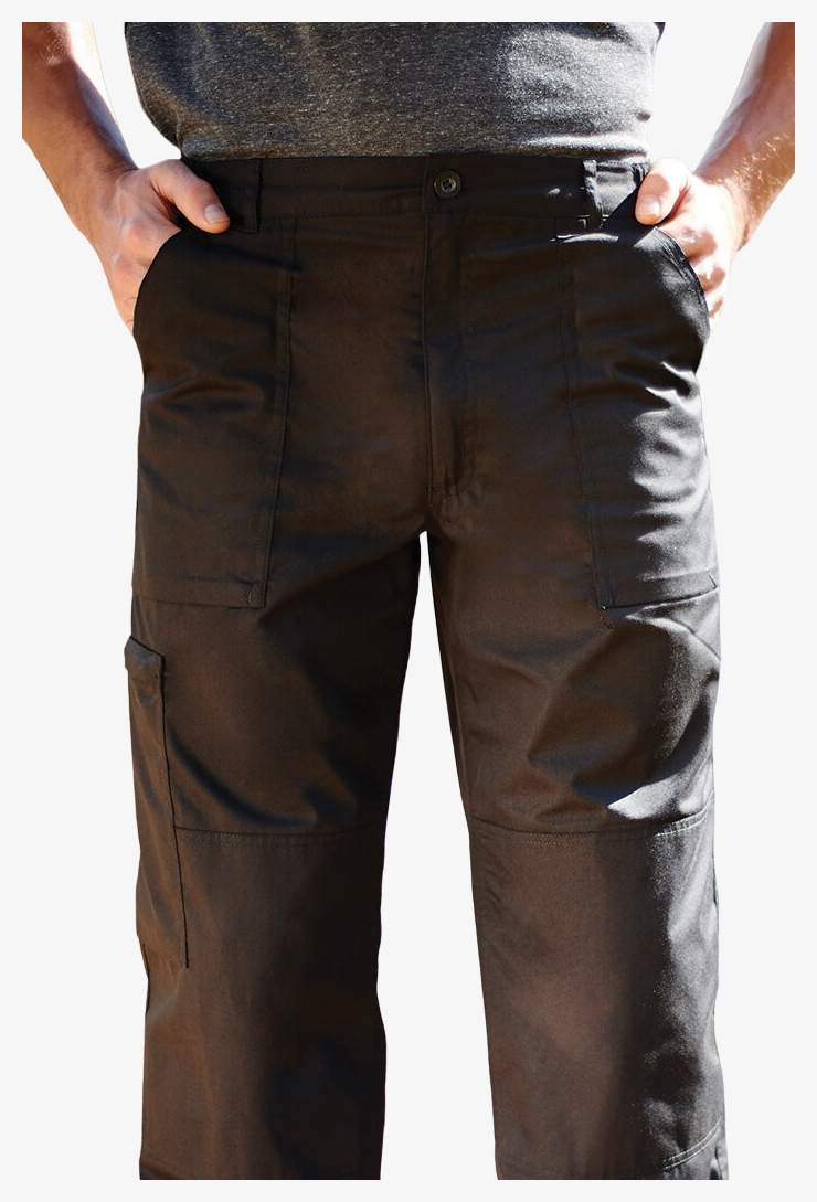 The New action trousers are made of water-repellent polycotton fabric. They include several pockets and knee reinforcements for better durability.