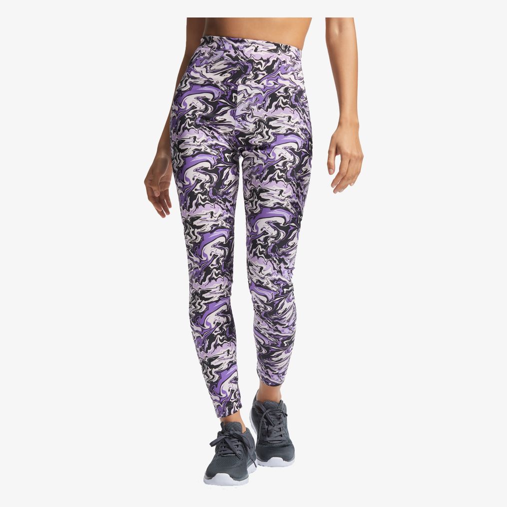 The patterned women's sports legging includes a high adjustable waist and a back pocket integrated into the waistband with a reflective band. A detachable label is present.