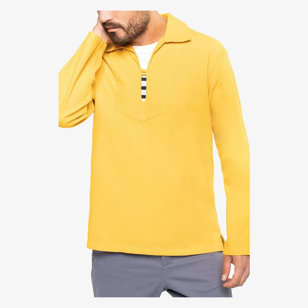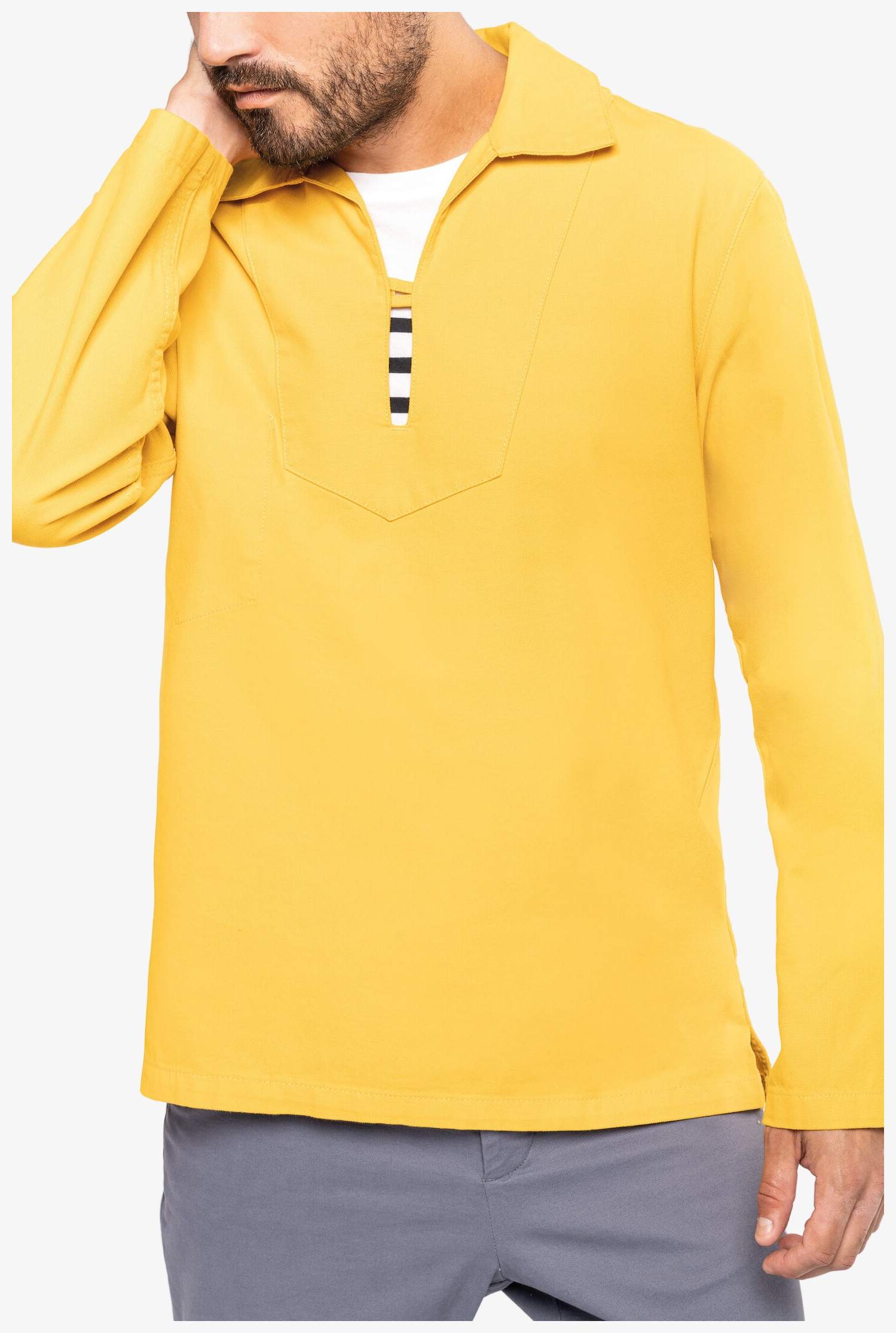 The vareuse is made of 100% cotton canvas with a specific treatment that gives it an aged appearance. It includes a large inner pocket, side slits, and a front opening closed by a button. This artisanal process creates color variations, making each piece unique.