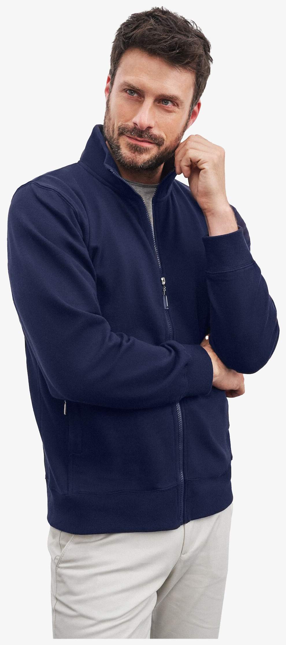 The Men's Jacket is made of ringspun combed cotton with a brushed fleece finish. It includes zippered side pockets and double-stitched seams. The cuffs contain elastane for a fitted adjustment.