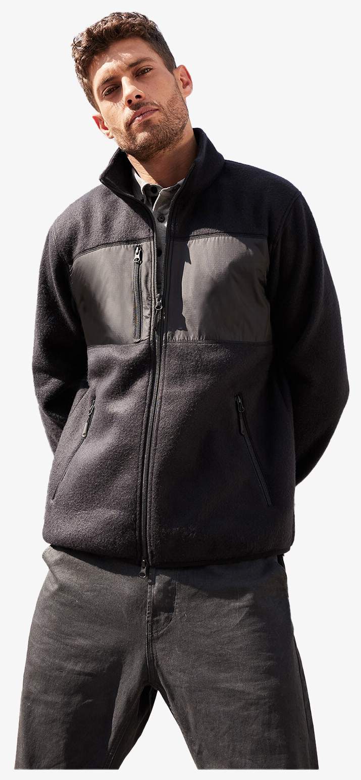 The Men's Fleece Jacket is a recycled polyester fleece, soft and easy to care for, featuring a stand-up collar and a two-way zipper at the front. Several pockets are integrated for convenient storage: two side pockets, one chest pocket with zipper, and two interior pockets.