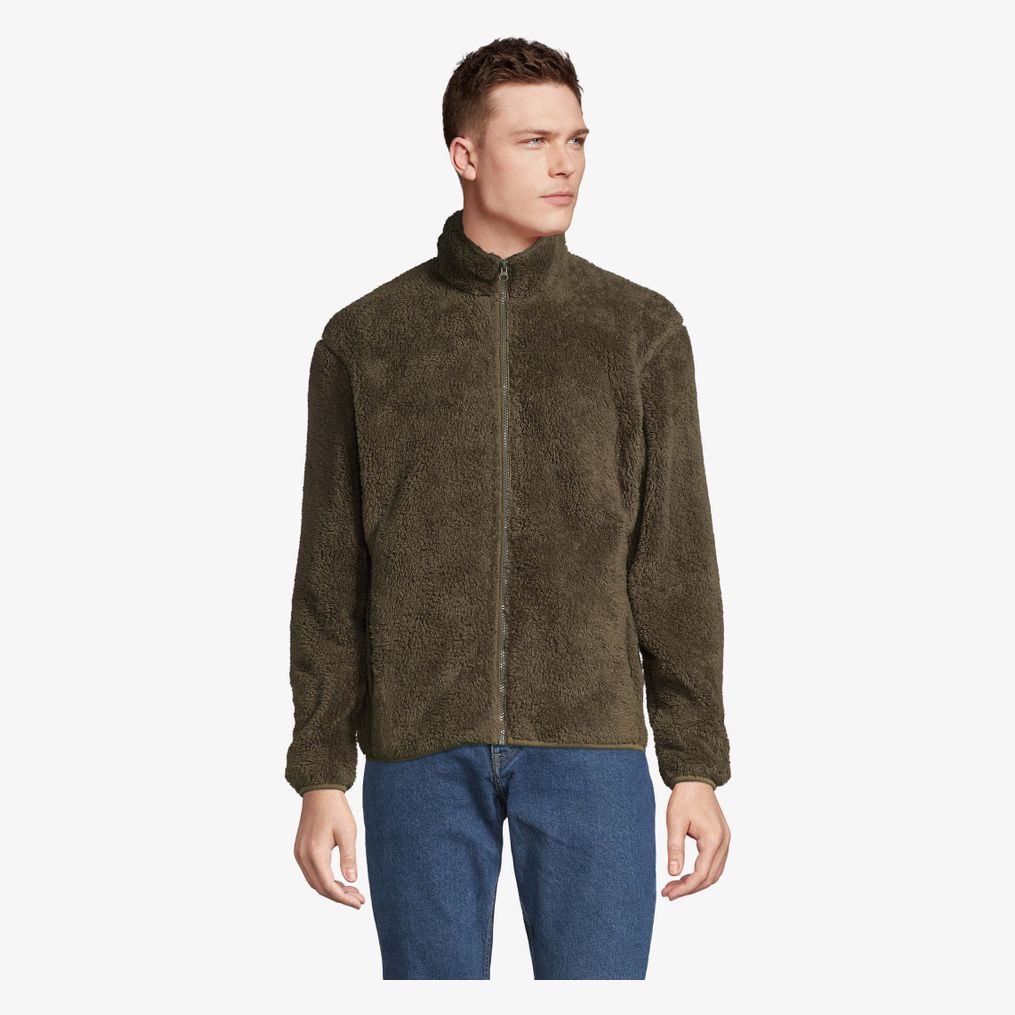 The unisex zip fleece jacket includes a main opening and side pockets with injected plastic zip and metal tone-on-tone puller. It is cut-sewn with a trim tape on the collar and tone-on-tone elastic trims on the cuffs and hem.