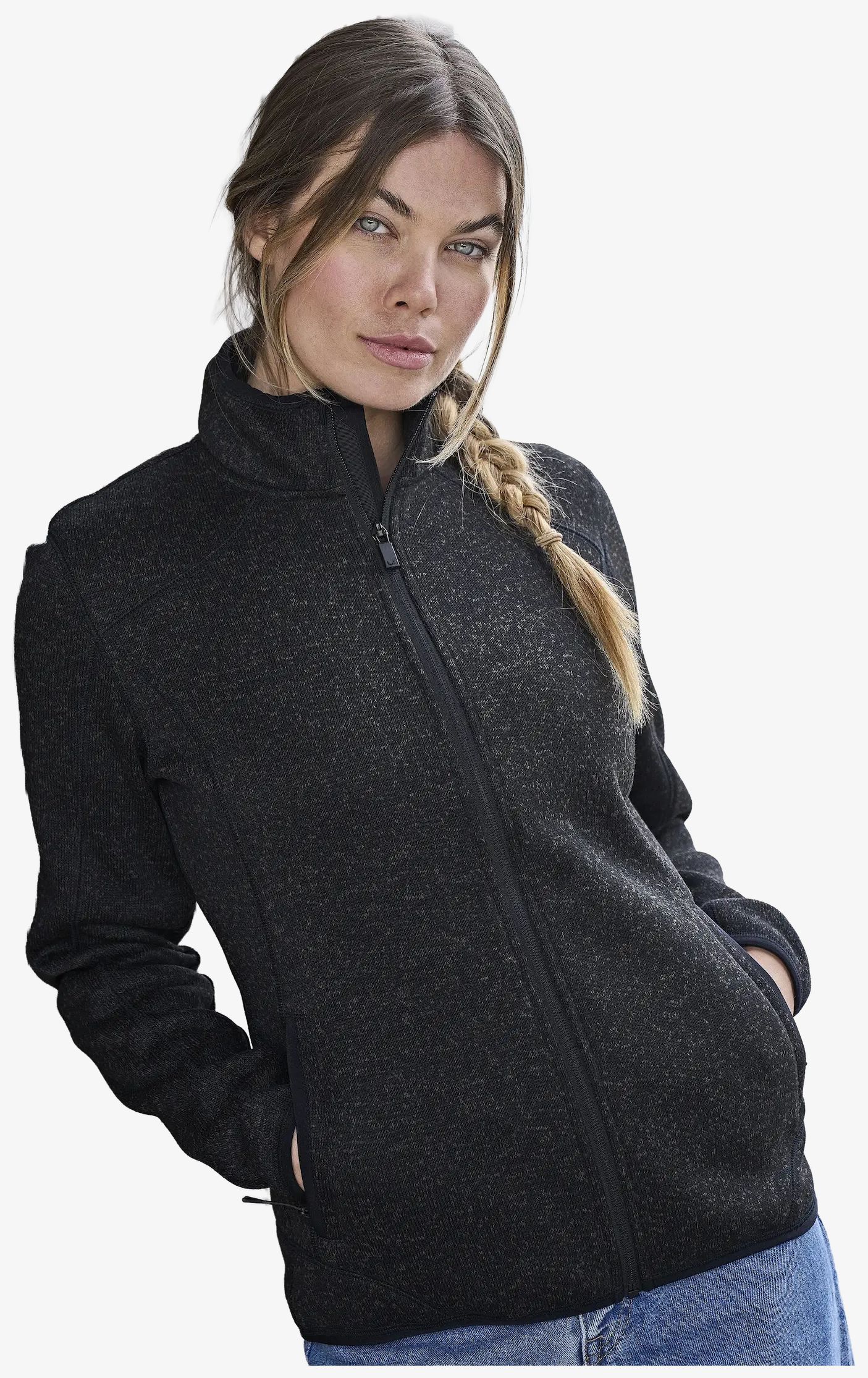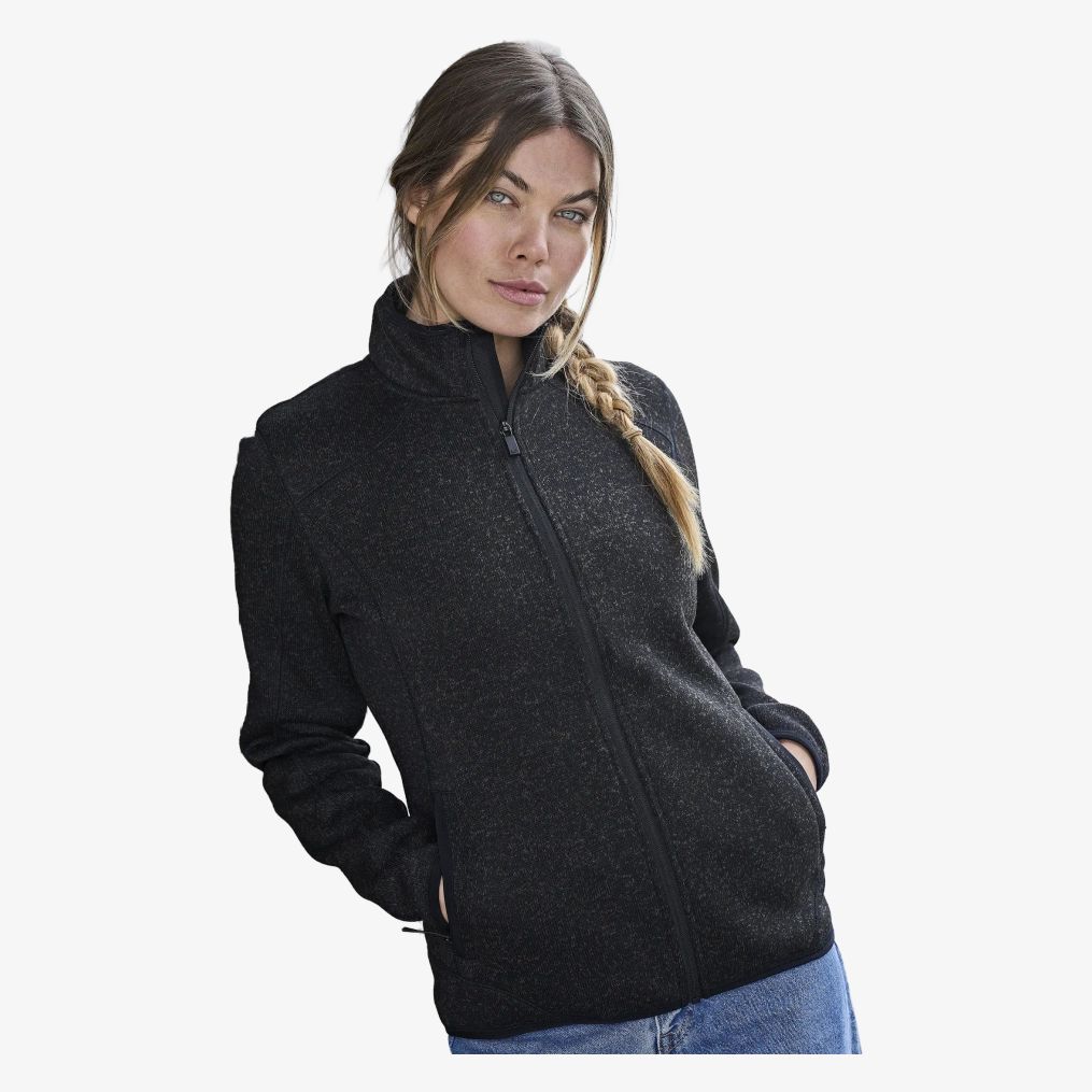 The Ladies Aspen Jacket is a polyester fleece with a zip and two large front pockets. Its brushed interior provides a soft texture.