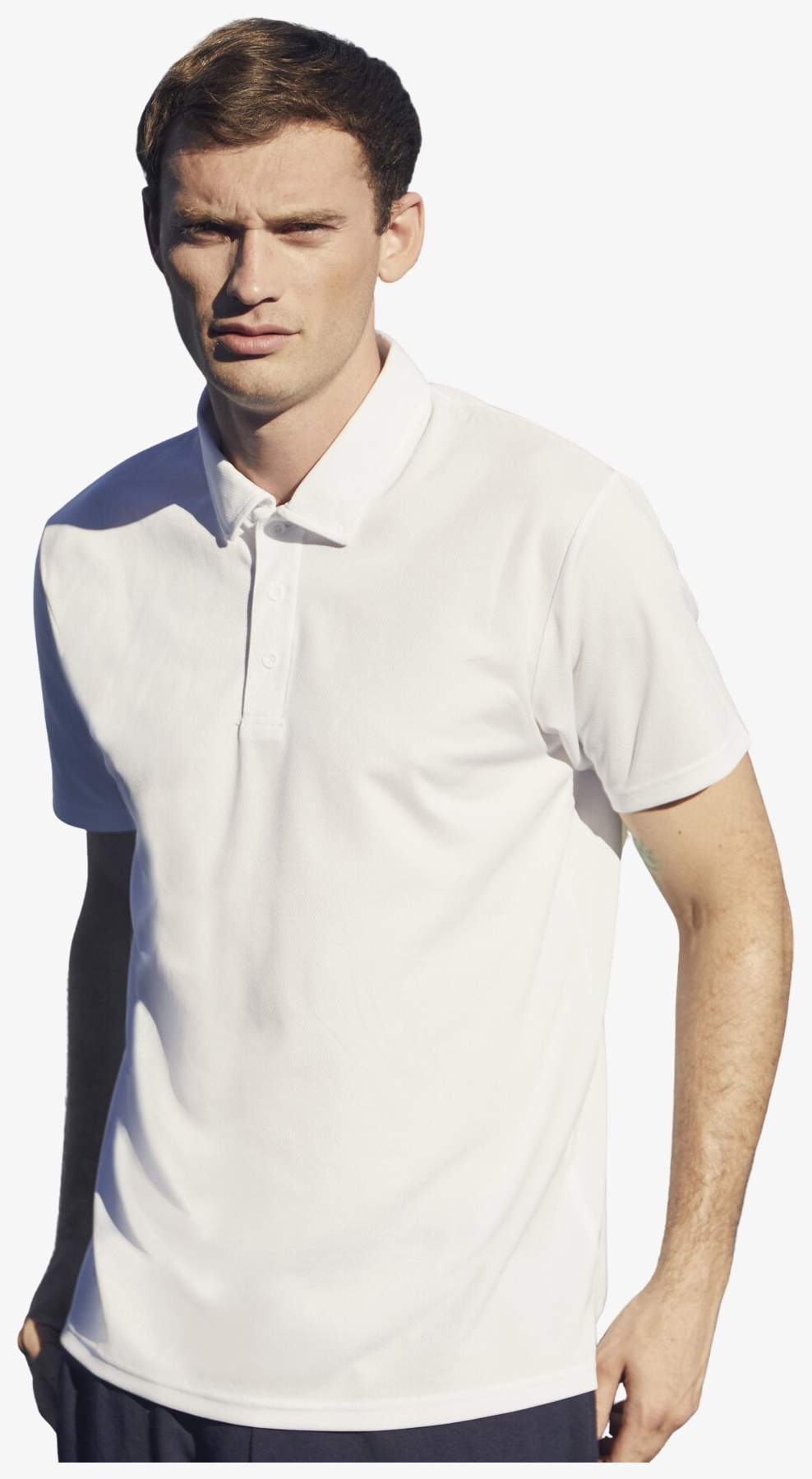 The Men's Performance Polo is made of polyester with moisture-wicking and quick drying. The neck tape is made of the same material. The button placket has three tone-on-tone buttons. The sleeves are set-in type. The label is printed in the collar for increased comfort.