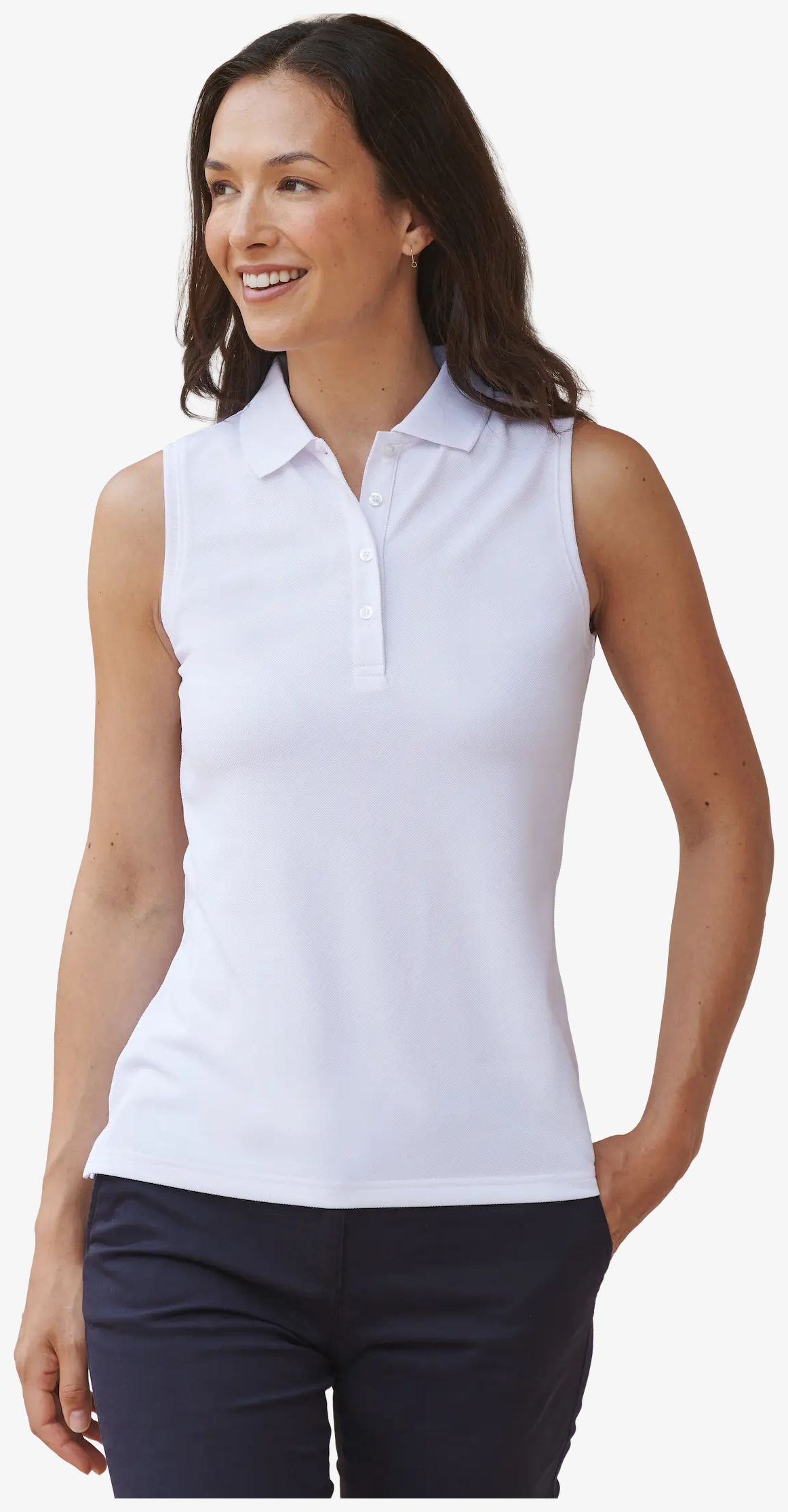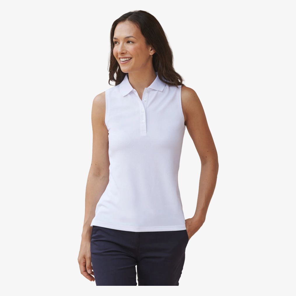 The sleeveless women's polo uses breathable Coolplus technology to improve ventilation. It features a narrow 4-button placket with ribbed edges on collar and armholes. Side slits facilitate movement.