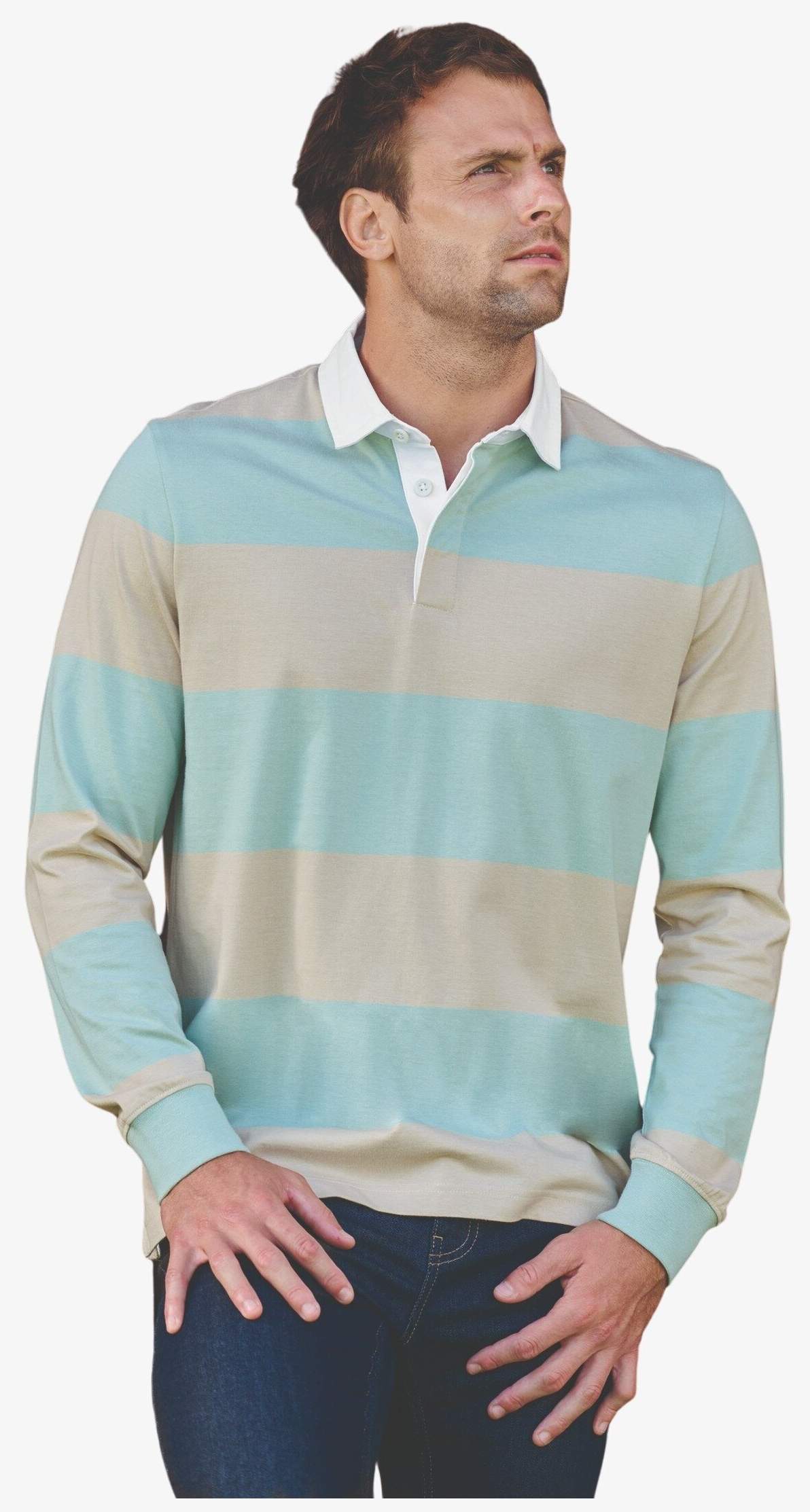 The unisex striped long sleeve polo is made of combed cotton with jersey knit. It features a contrast cotton twill collar and an invisible placket with 3 tone-on-tone rubber buttons. The cut is fitted with silicone shoulder reinforcement for support. The sleeve cuffs are tubular double-layered ribbed with elastane to limit wrist deformation.