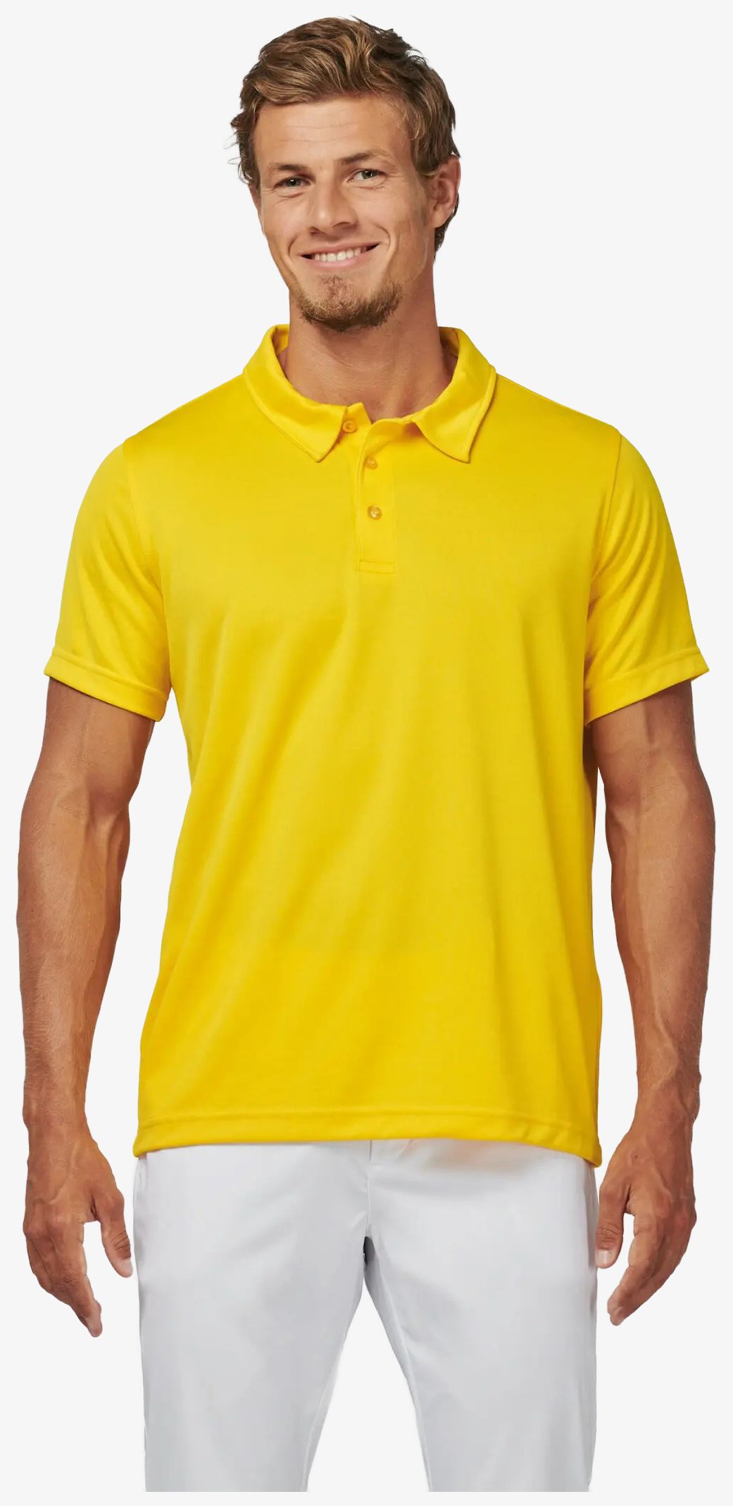 The short sleeve sport polo is made of 50% polyester cool plus® and 50% polyester. It features a breathable structure with quick drying. The placket has 3 buttons. Double needle finishing is applied at the hem and sleeves.