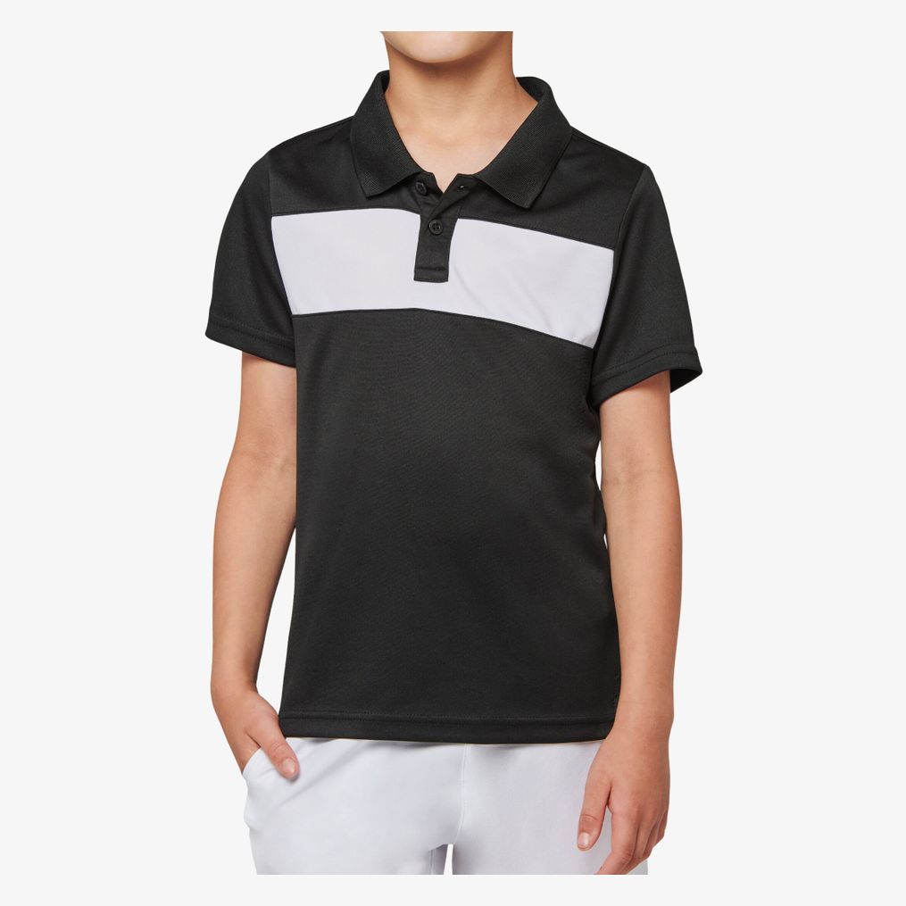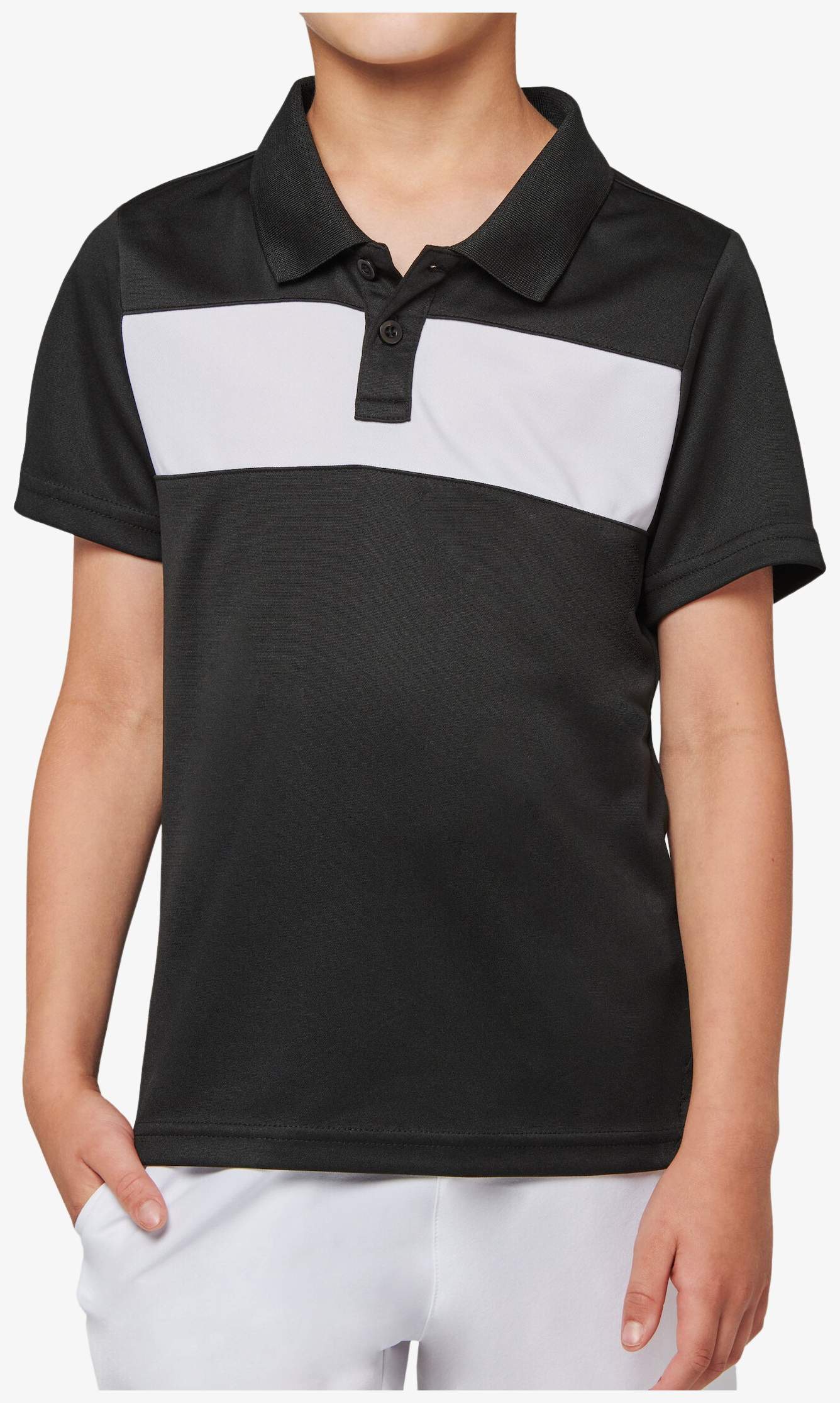 The child short-sleeve polo pa494 is made of 100% polyester interlock knit with quick-drying fabric. It features a contrast chest panel, ribbed collar with tape, tone-on-tone 2-button placket, and side vents.