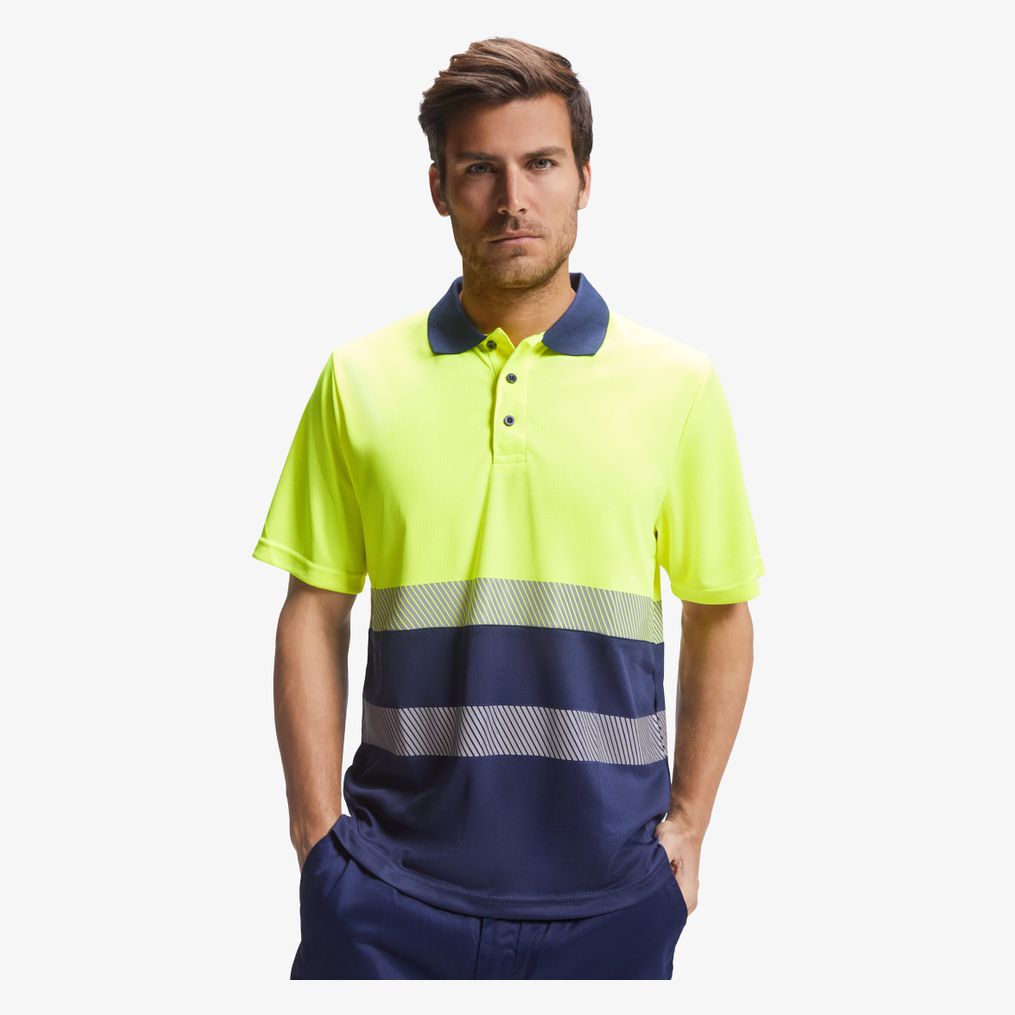 The high visibility technical short sleeve polo Vega includes two segmented reflective bands on the chest and back as well as a 3-contrast-button placket. The collar is 1x1 rib and the fabric is designed to resist snags while ensuring easy drying. A pocket is optionally available with a detachable label.