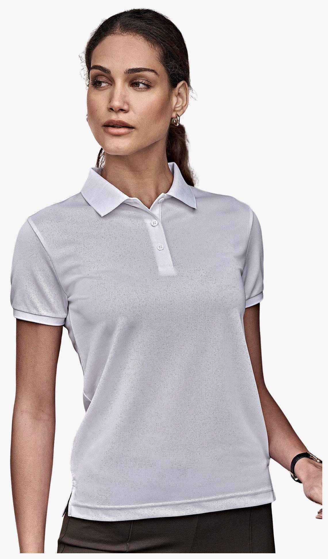 The women's polo shirt in recycled polyester offers a slim fit with a 3-button placket and flat knit collar. It wicks moisture and ensures quick drying.