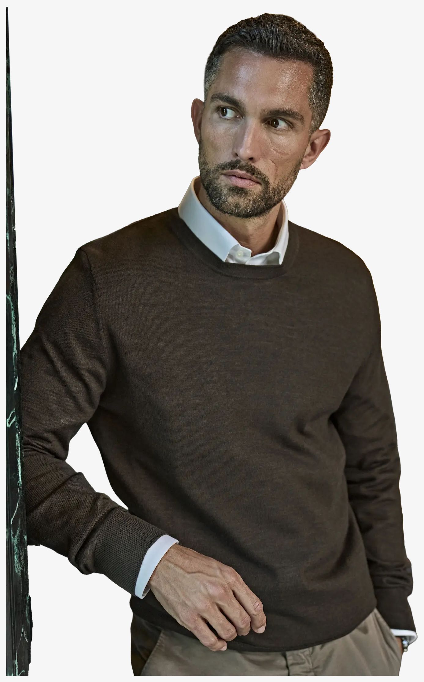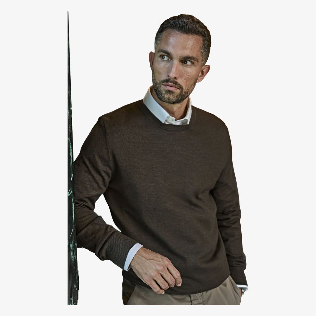 The men's crew neck sweater is made of Merino wool and acrylic, combining natural and synthetic fibers. Its slim fit and gauge 14 define its style and structure.