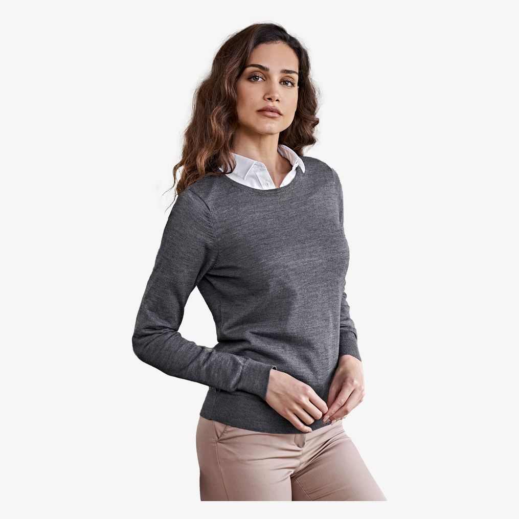 The round neck women's sweater has a fitted cut with ribbed cuffs and waist. The knit is made in gauge 14 for a regular structure.