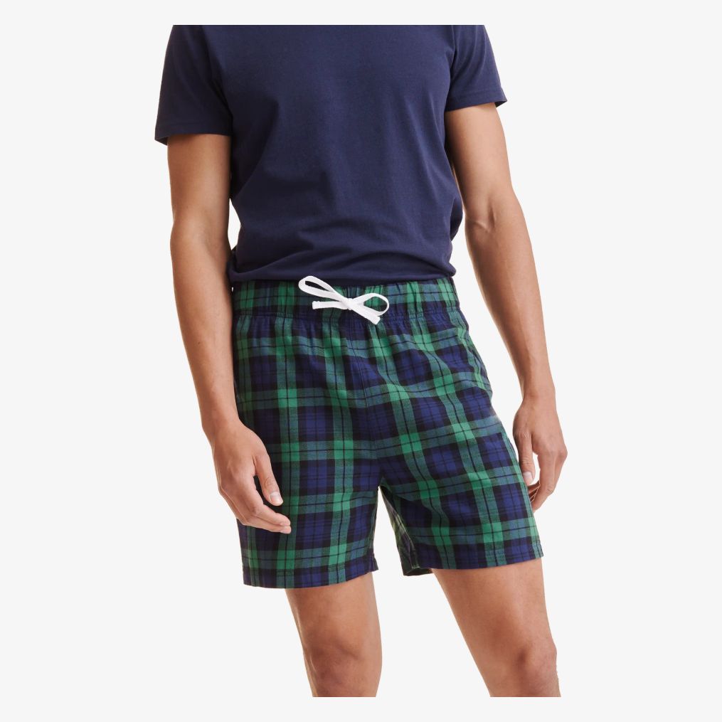 The men's short pajamas include an elastic waistband with contrast drawstring, a patch back pocket, flat hems and a detachable label.