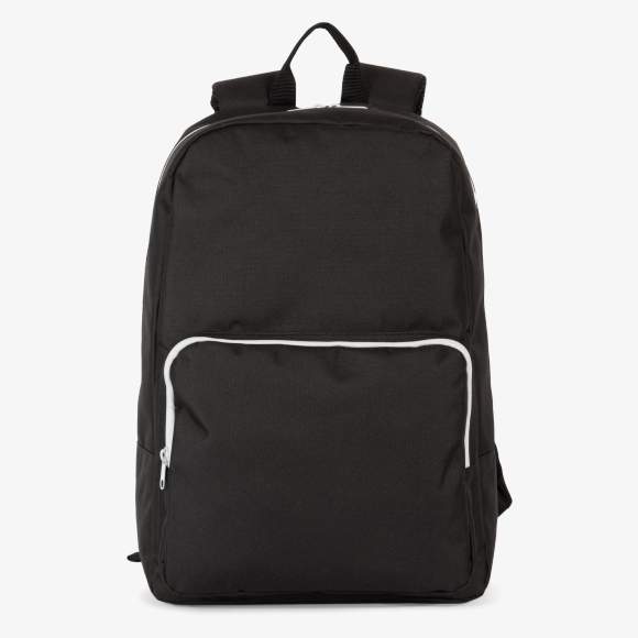 The polyester backpack with contrasting zip closures includes a main padded compartment that fits a laptop or tablet up to 15 inches. A large panel pocket is located on the front.