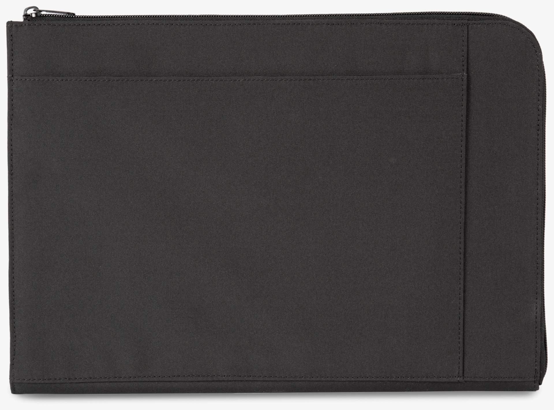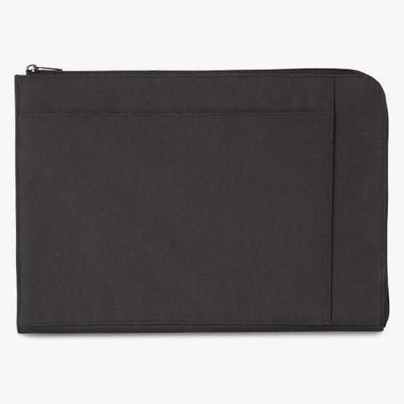 The tablet document case is padded and made of recycled polyester. It includes a zip closure on two sides and an inner pocket for storage.
