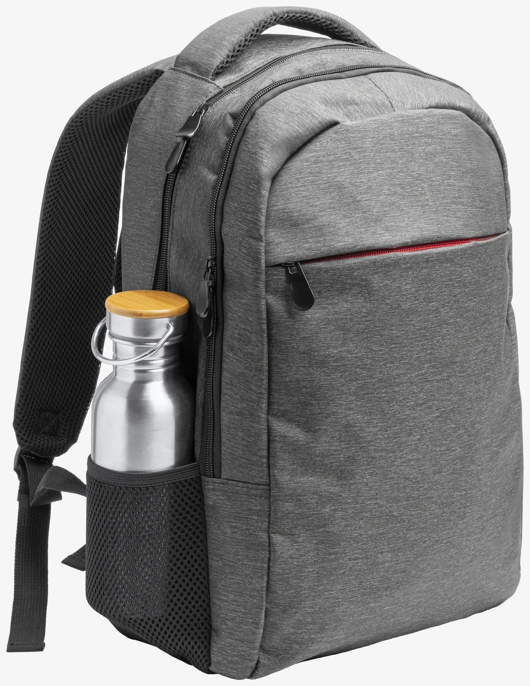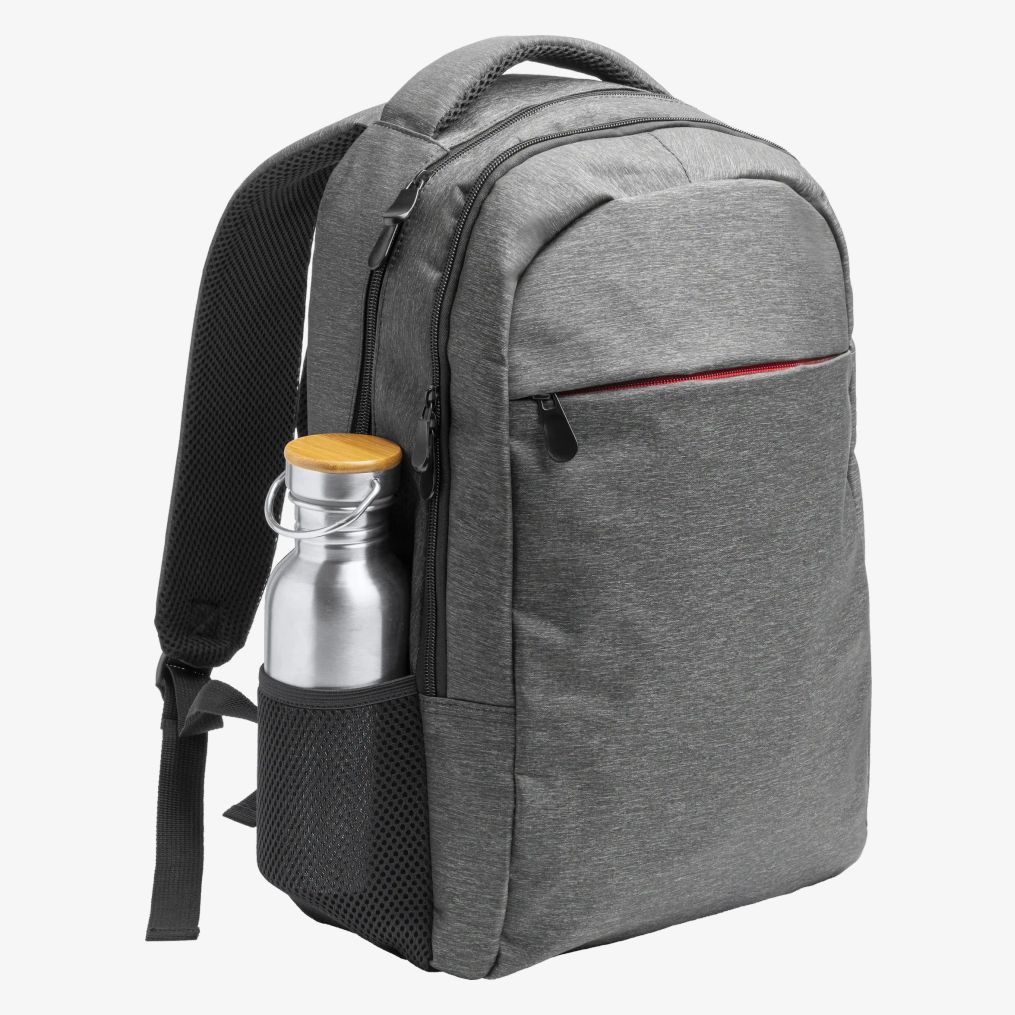 The CHUCAO backpack is made of melange polyester for laptop transport. It includes a double front compartment and side pockets. The shoulder straps, back and handles are padded for added comfort.
