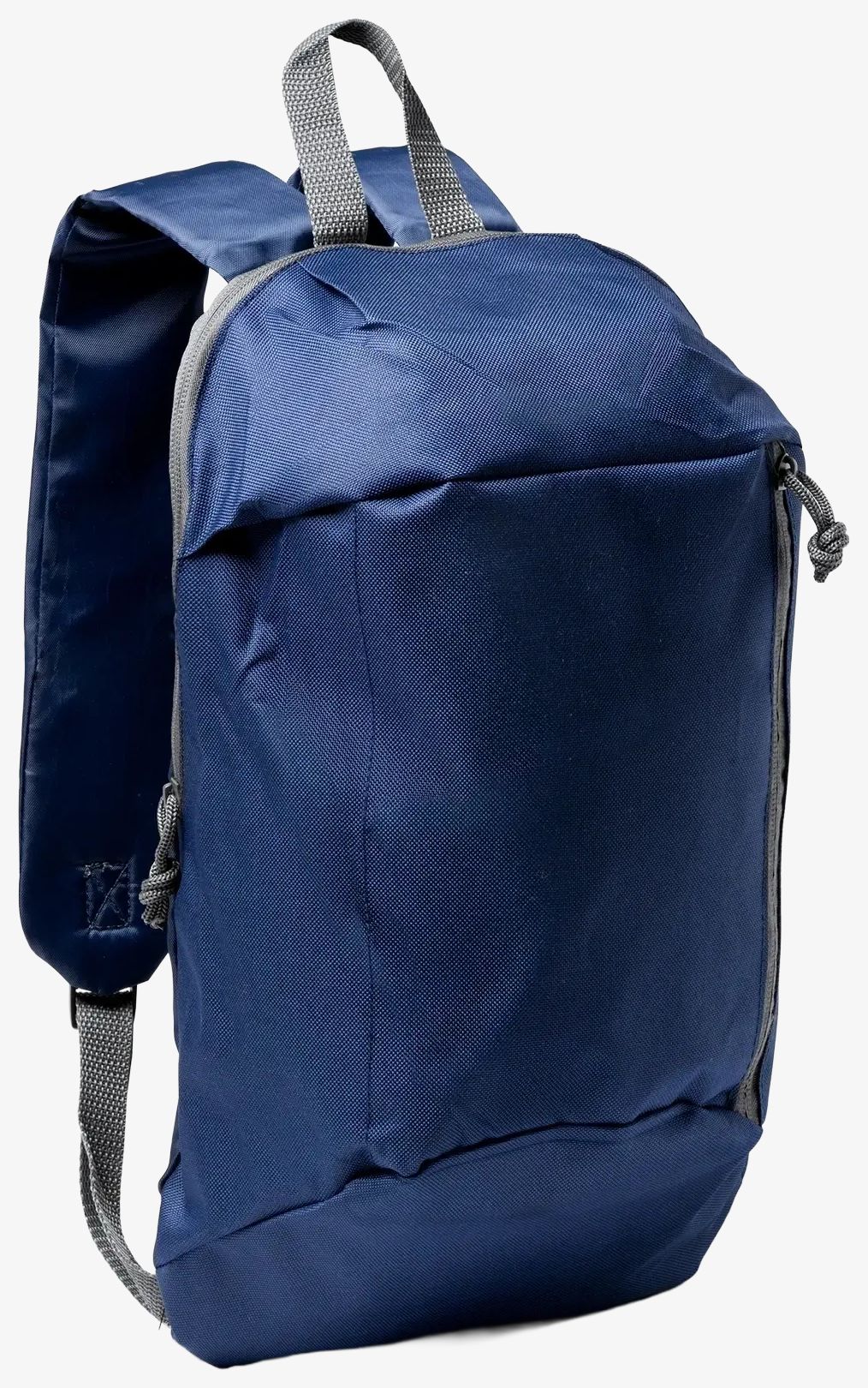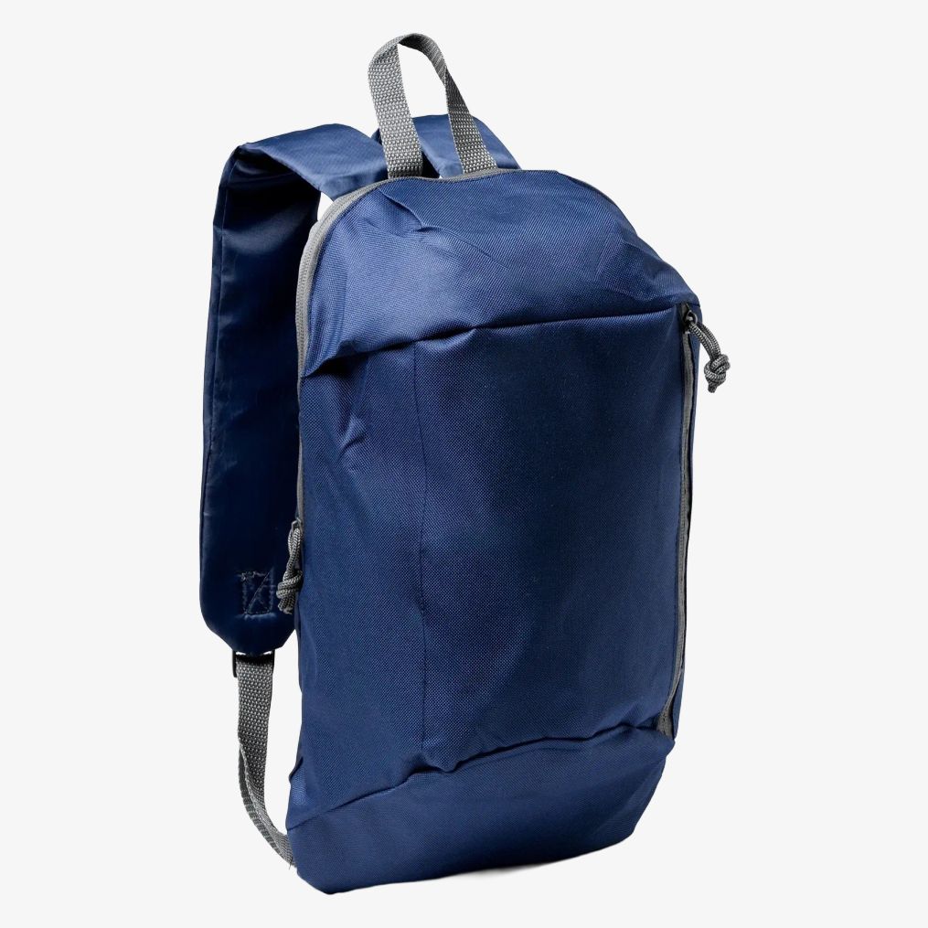 The polyester backpack features adjustable straps and a top handle for hanging. It includes a front pocket with vertical zipper closure. Capacity is 7 liters and it has compact dimensions of 23 x 40 x 12 cm.