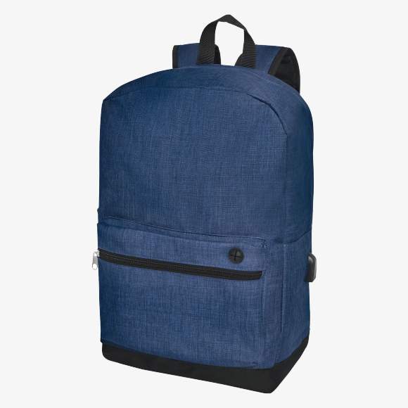 The Hoss professional backpack for 15.6\" laptop features a large main zippered compartment with integrated laptop sleeve. It includes a front zippered compartment for quick access to mobile devices and a USB port with USB-A cable equipped with male and female connectors. This bag has padded shoulder straps, a carrying handle, and a mesh pocket suitable for a water bottle. Minor color variations may occur due to dyeing and weaving.