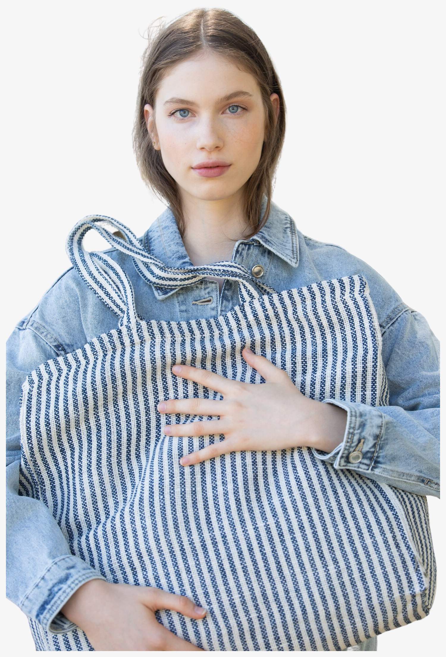 The juco shopping bag is made of jute and cotton with a square shape and yarn-dyed stripes. It includes a zipped inner pocket and 55 cm handles in matching fabric.