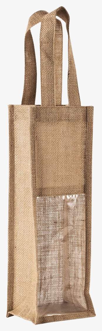 The jute bottle carrier bag is designed to hold one bottle. It features two handles and a transparent window on the front.