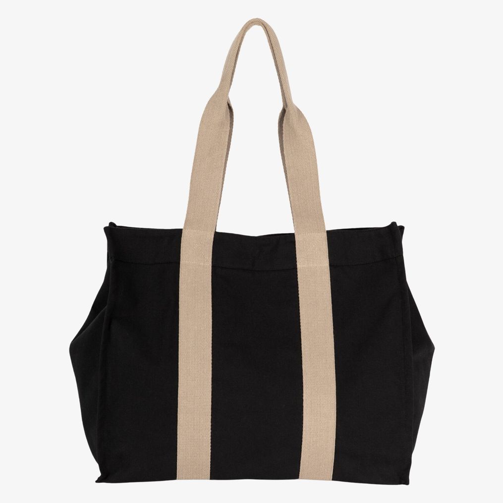 The large recycled gusset shopping bag is made of recycled cotton and polyester. It includes handles sewn along the entire length of the body of the bag for increased resistance. An inner pocket with zipped closure allows to securely store keys and phone. The closure is by magnetic button. Dimensions are 44 x 22 x 38 cm, with a capacity of 36 liters.