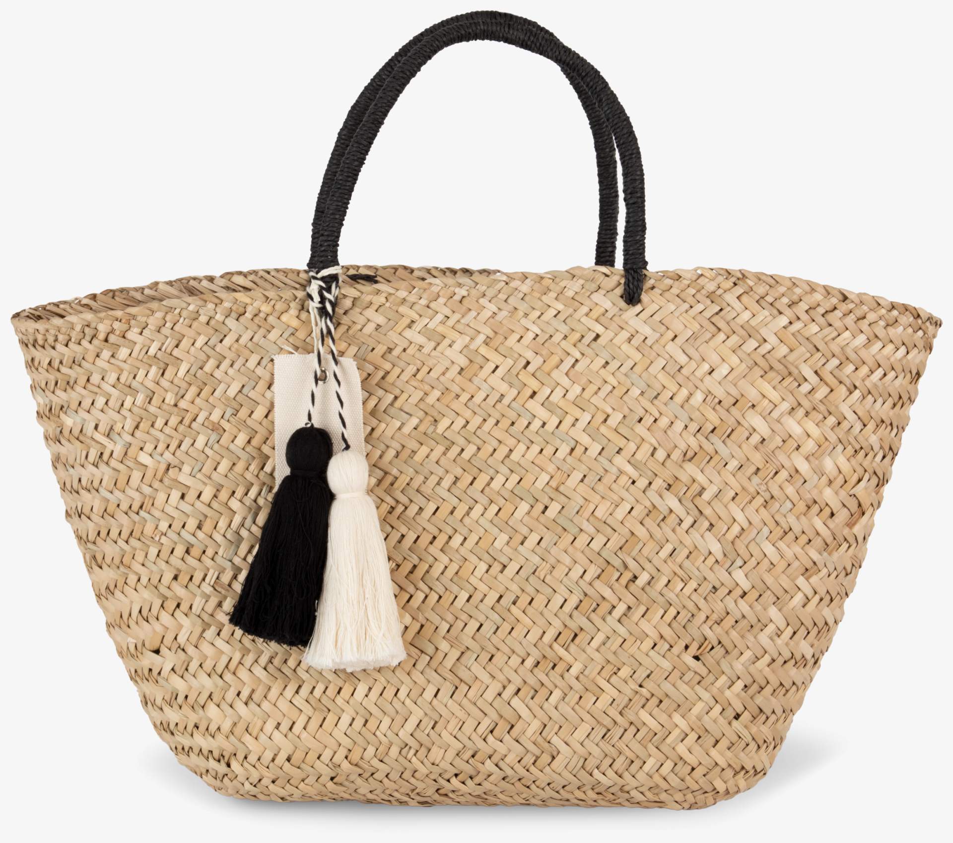 The woven straw shopping basket is made of natural fibers with a two-tone pompom and a large cotton label. It has a 20-liter capacity and dimensions of 56 cm x 16 cm x 29 cm.