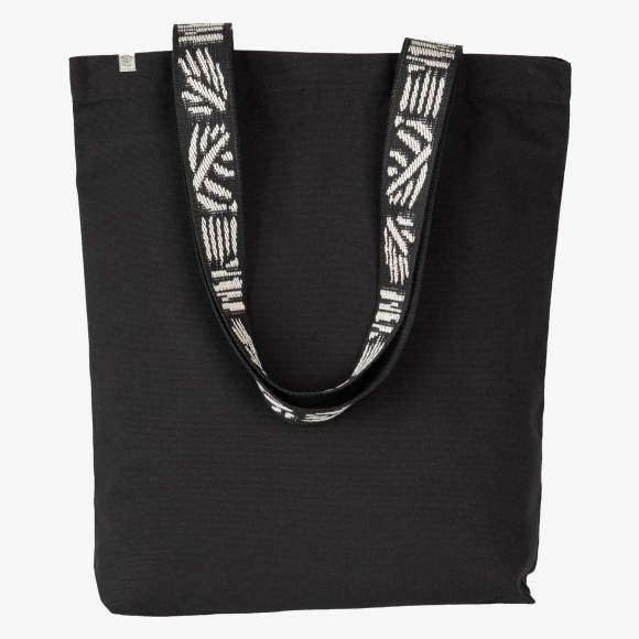 Recycled shopping bag designed with 60 cm long and 4.25 cm wide contrast handles for adapted grip. Capacity is 12 liters with dimensions 38 cm by 42 cm.