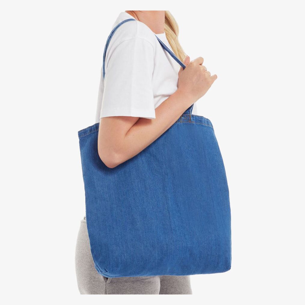 The Denim bag is a shopping bag made of organic or transitional cotton. It is made of 9oz denim with an 8 cm folded bottom and long straps. This bag has cross stitching at the base of the handles for stability, folded corners and double topstitching. The label is detachable.