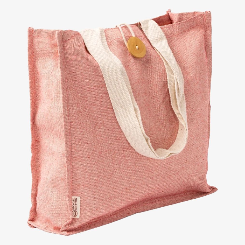 The recycled cotton shopping bag features a heathered finish and reinforced 70 cm long handles. It has a button closure.