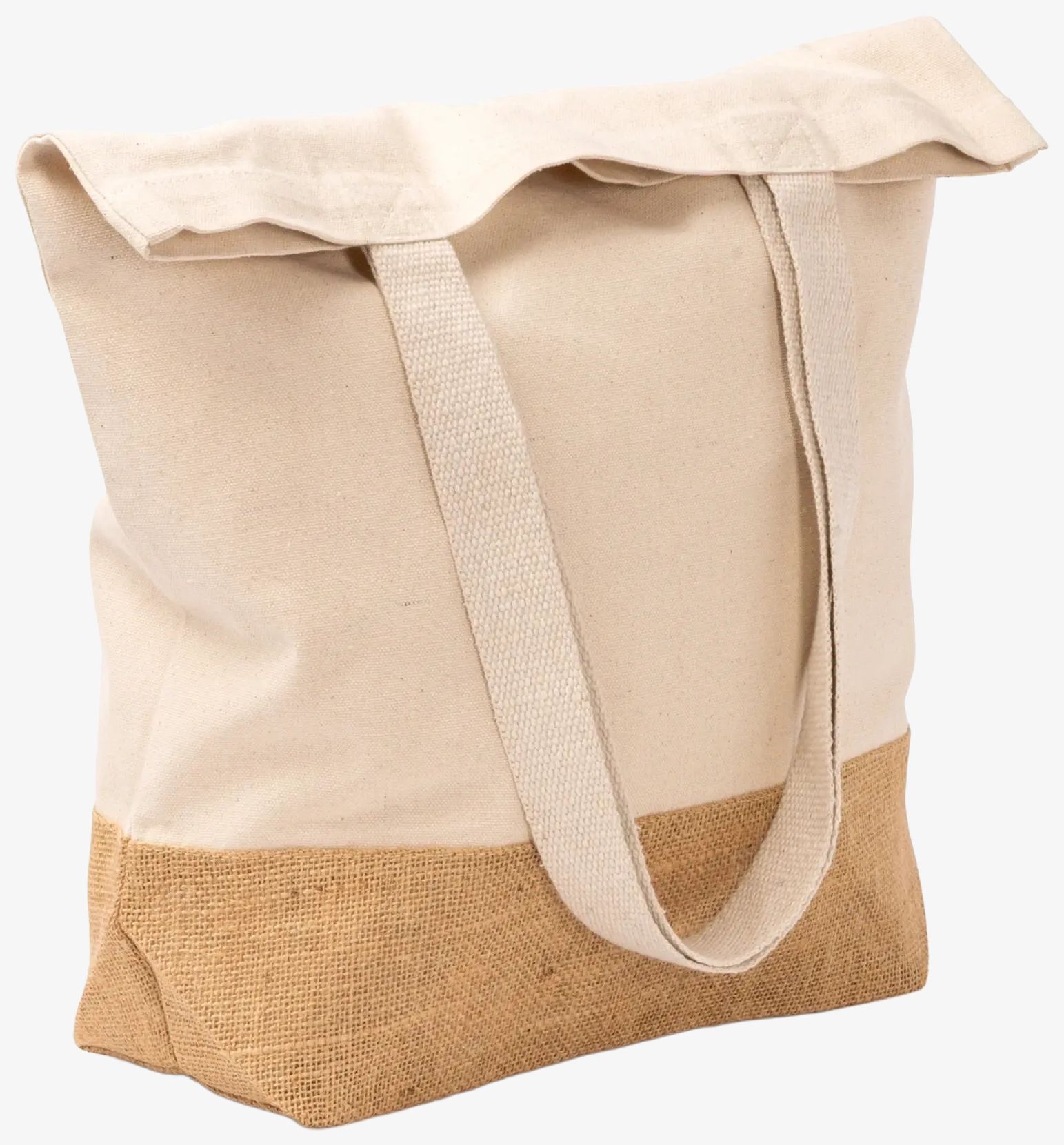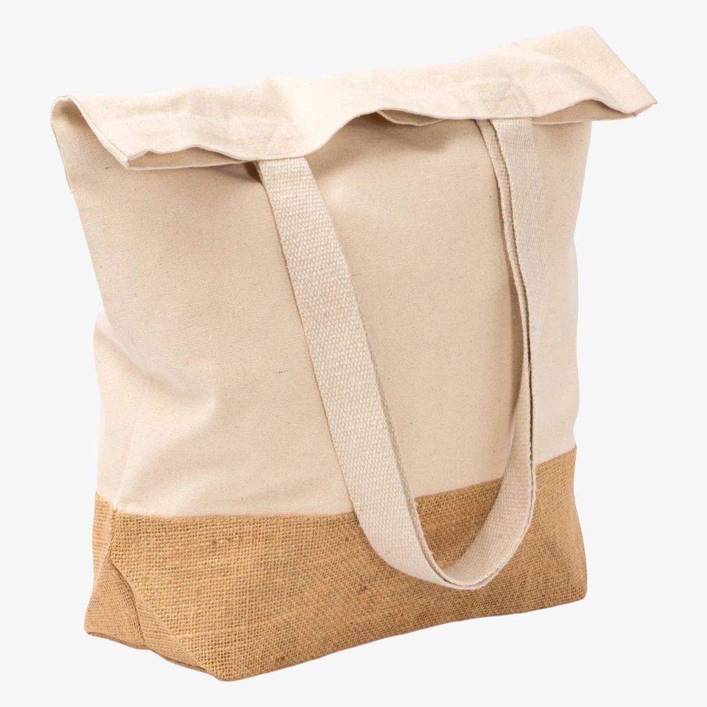The shopping bag is made of recycled cotton and natural jute, providing a sturdy and environmentally friendly material. The handles measure 70 cm in length, easing transport.