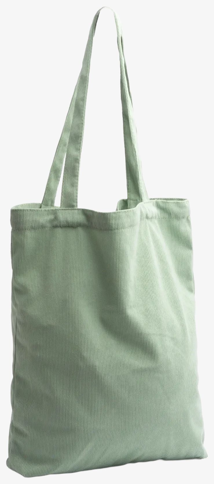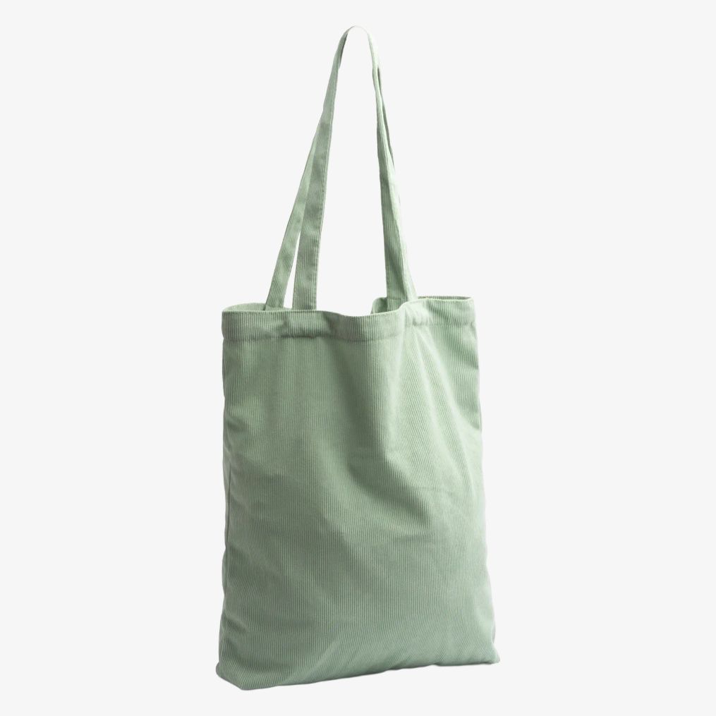 The corduroy shopping bag features long 60 cm handles suitable for shoulder carrying. Its dimensions allow transport of various items in a compact and practical format.